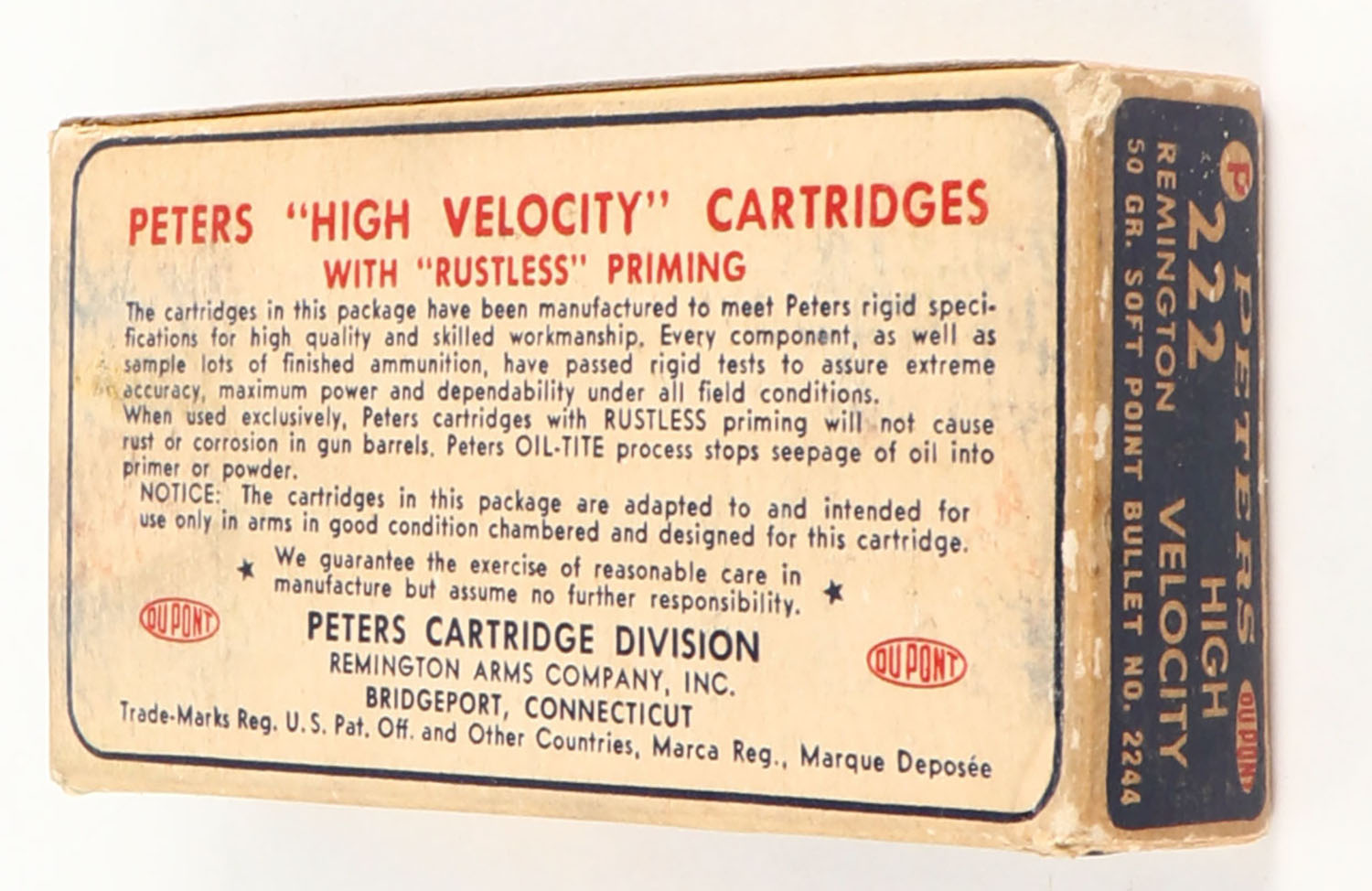 Peters, High Velocity, .222 Remington, 50 Grain Soft Point Bullet, Full, 1pc. Blue white & red box, box is solid with very good color, minor age soiling, some shelf wear, very minor corner wear, edges are crisp, end flaps are solid, ammo is excellent. Grade: Very Good ++ - Value: 20 to 60