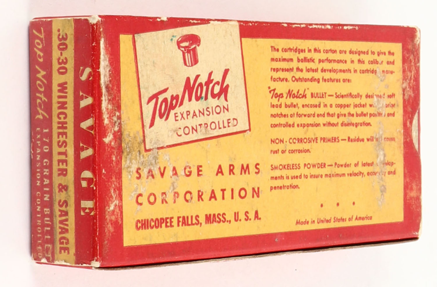 Savage, Hi-Power Cartridges, .30-30 Winchester, 170 Grain Bullet, Full, 1pc. Red & yellow box, box is solid with very good color, minor age soiling, factory seam has unadhered, some shelf & corner wear, very minor edge wear, end flaps are solid, ammo is excellent. Grade: Very Good ++ - Value: 60 to 180