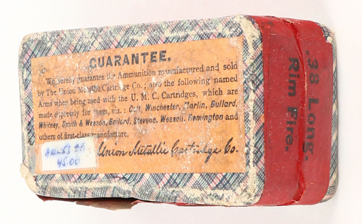 UMC, Rim-Fire Cartridges, .38 Long Rim Fire, Swaged Bullets, FULL & SEALED, 2pc. Purple fabric box with green top & red side sealing labels, box is solid with excellent color, some shelf wear, minor corner wear, very minor edge wear, labels are intact. Grade: Excellent - Value: 30 to 90