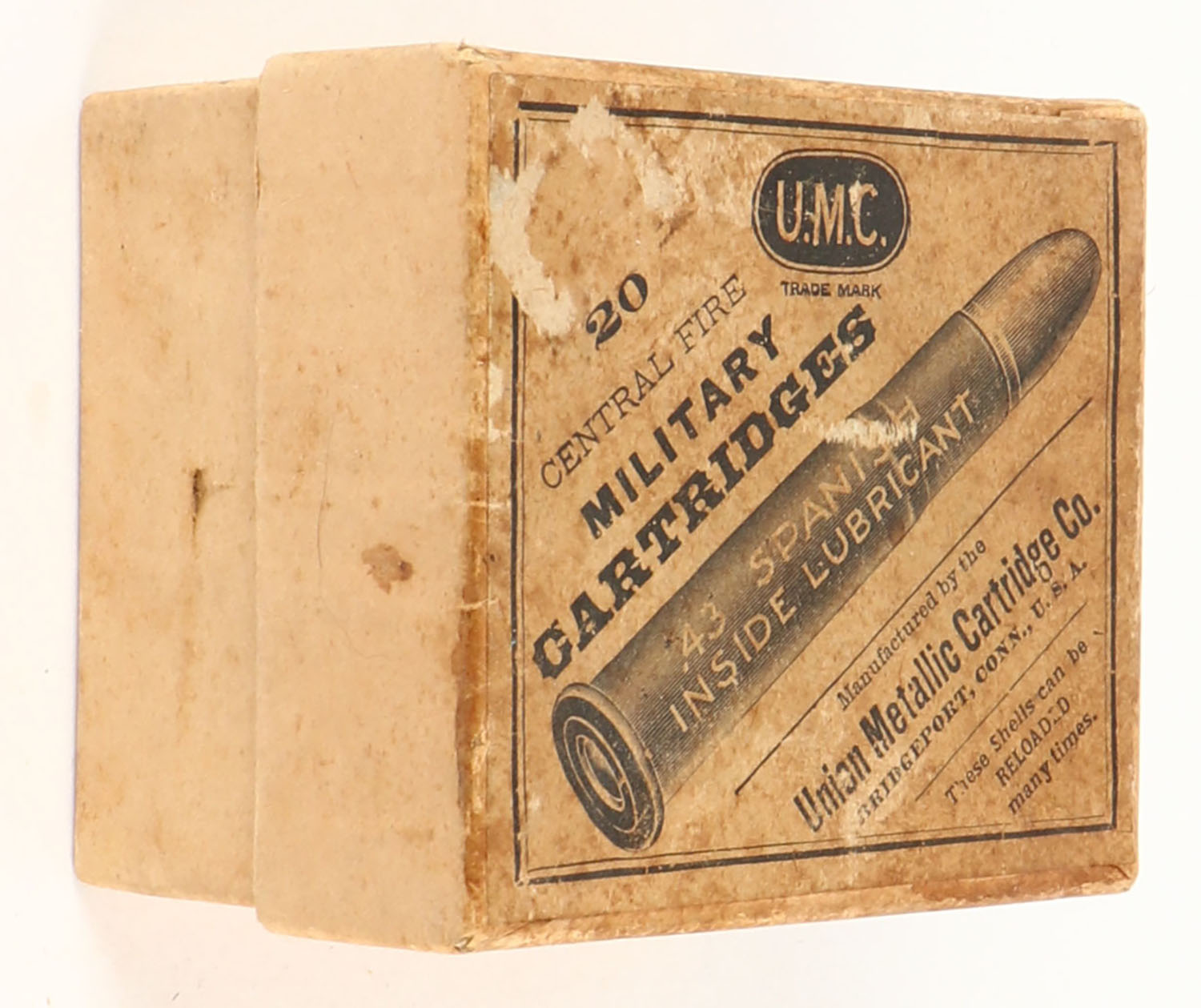 UMC, Military Cartridges, .43 Spanish, Inside Lubricant, Partial 19rds., 2pc. Buff box with buff top label, box is solid with excellent color, some shelf wear, minor age soiling, very minor edge & corner wear, label is intact, ammo is excellent. Grade: Excellent - Value: 30 to 90