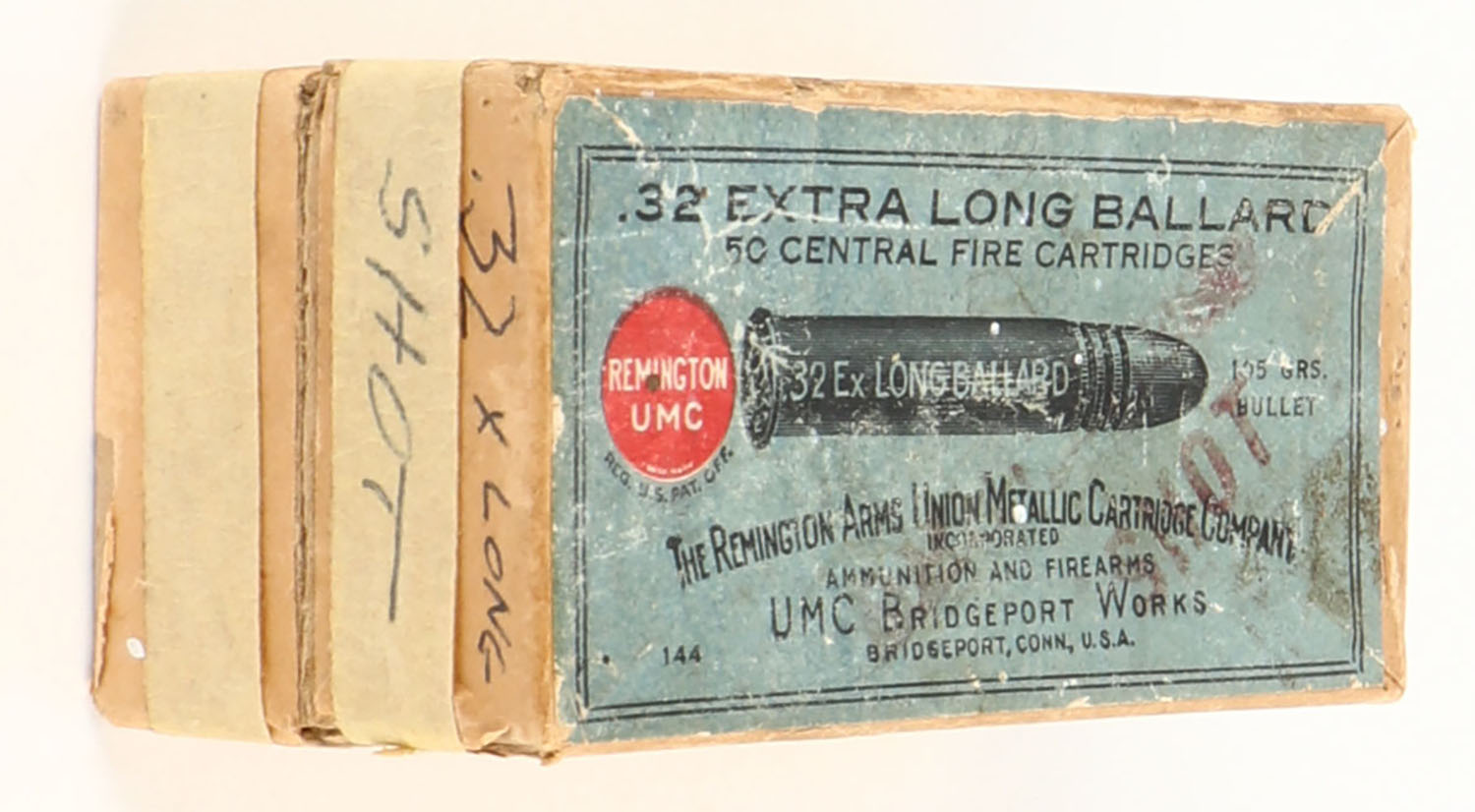 REM-UMC, Central Fire Cartridges, .32 Extra Long Ballard Shot, Full, 2pc. Buff box with blue top label, box is solid with very good color, some age soiling & shelf wear, very minor corner wear, edges are mostly crisp, tape wrapped around sides of box, top label is intact, ammo is excellent. Grade: Very Good - Value: 40 to 120