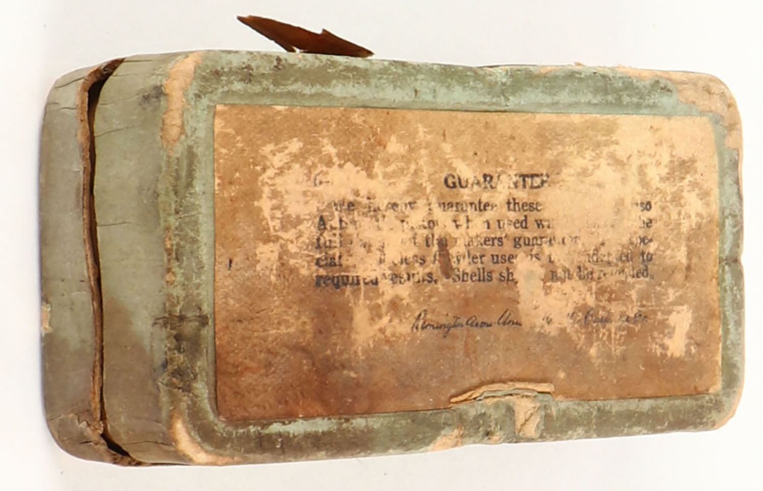 REM-UMC, Central Fire Cartridges, .32 Automatic Colt, Partial 37rds. correct, 2pc. Blue box with buff top & side sealing labels, box is solid with fair to good color, age soiling, large stain on top, some corner wear, minor edge wear, side sealing label is 5% intact, ammo is excellent. Grade: Good - Value: 10 to 50