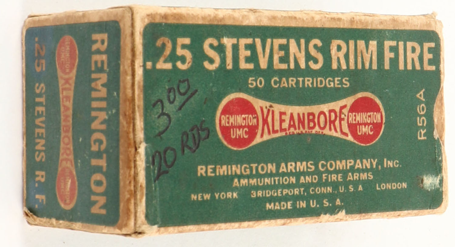Remington, Kleanbore, .25 Stevens Rim Fire, Full, 1pc. Green buff & red dog bone box, box is solid with very good to excellent color, some age soiling, top has been written on, some edge & corner wear, end flaps are solid, ammo is excellent. Grade: Very Good + - Value: 60 to 180