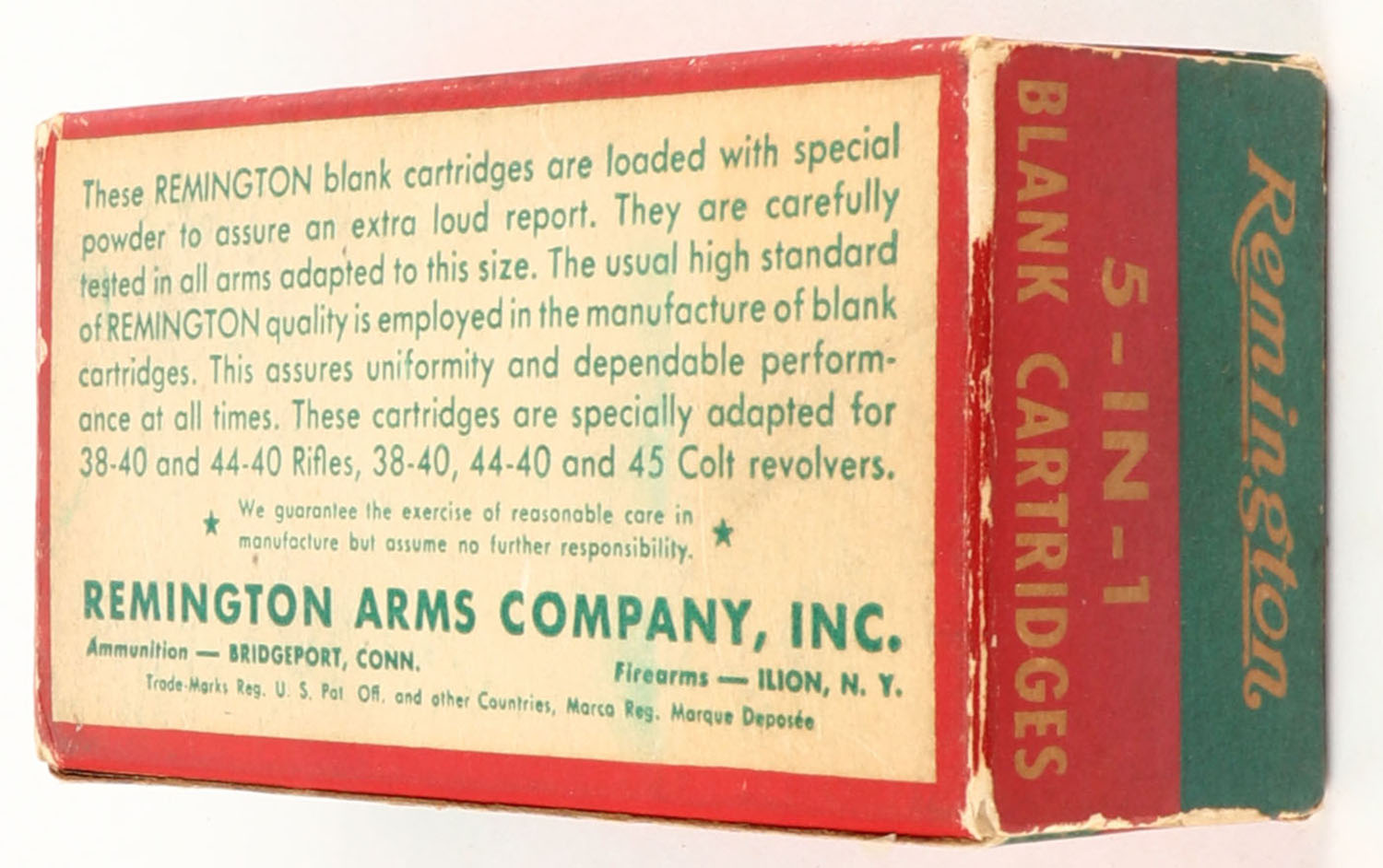 Remington, 5-in-1 Blank Cartridges, Partial 45rds., 1pc. Green red & buff box, box is solid with very good color, age soiling, tape stain on top, minor corner wear, very minor edge wear end flaps are solid, ammo is excellent. Grade: Very Good + - Value: 14 to 40