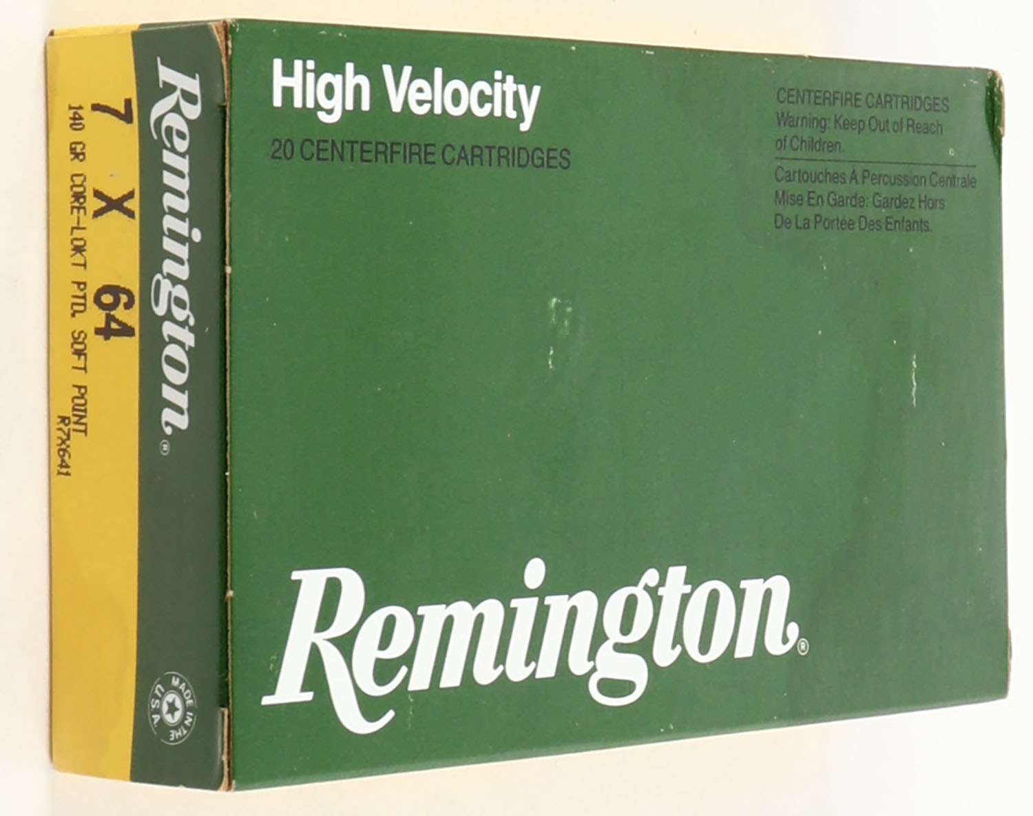 Remington, High Velocity, 7 x 64, 140 Gr. Core-Lokt Ptd. Soft Point, Full, 1pc. Green, yellow & white box, box is very solid with excellent color, end flaps are solid, ammo is excellent. Grade: Excellent + - Value: 20 to 60