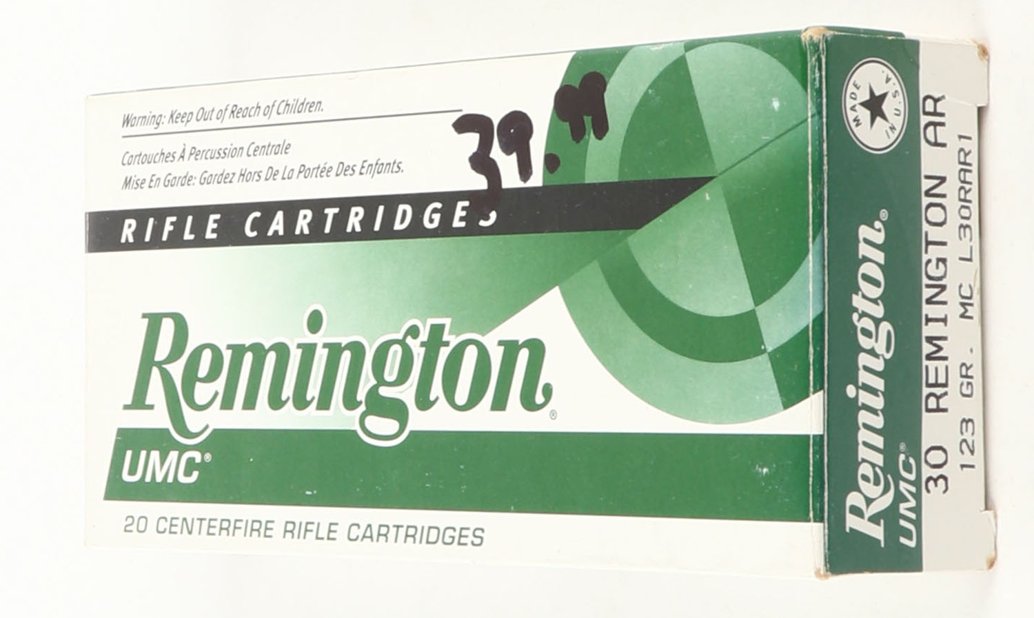 Remington, UMC, .30 Remington AR, 123 Grain MC, Partial 15rds, 1pc, Green, white & black box, box is very solid with very nice color, ammo is excellent. Grade: Excellent - Value: 8 to 40
