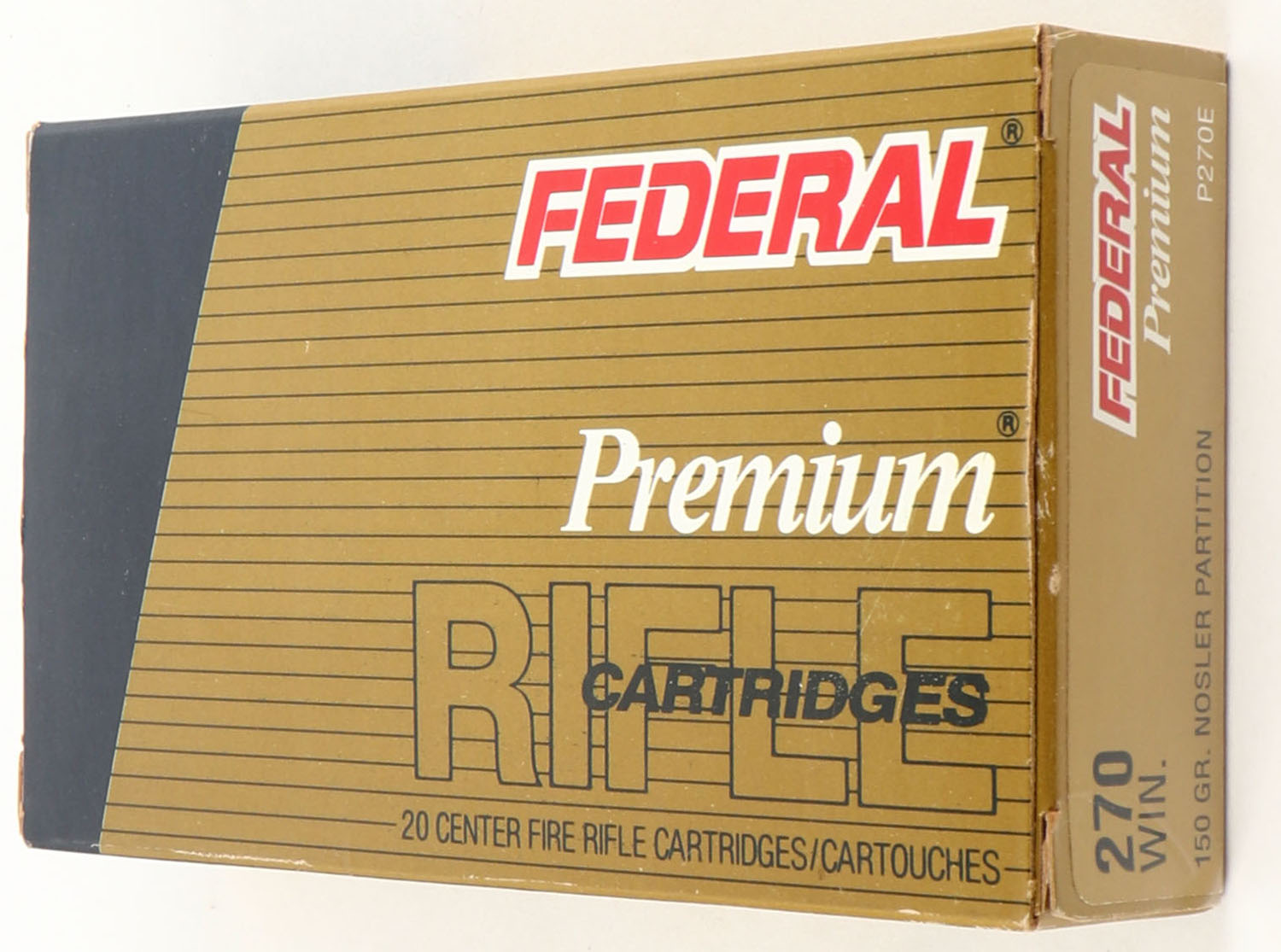 Federal, Premium, .270 Winchester, 150 Grain Nosler Partition, Partial 15rds, 1pc., multi-colored box, box is solid with great color, end flaps are solid, ammo is excellent. Grade: Excellent + - Value: 14 to 40