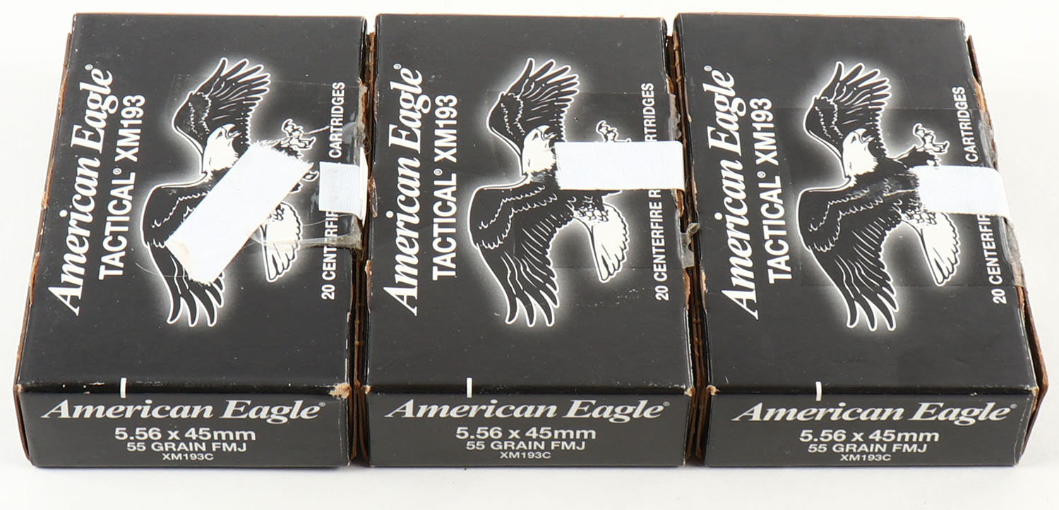 Federal, Lot of (3), American Eagle, 5.56x45mm, 55 Grain FMJ, Full, 1pc. Black & white box, boxes are solid, all boxes have tape to seam, ammo is excellent. Grade: Excellent - Value: 16 to 60