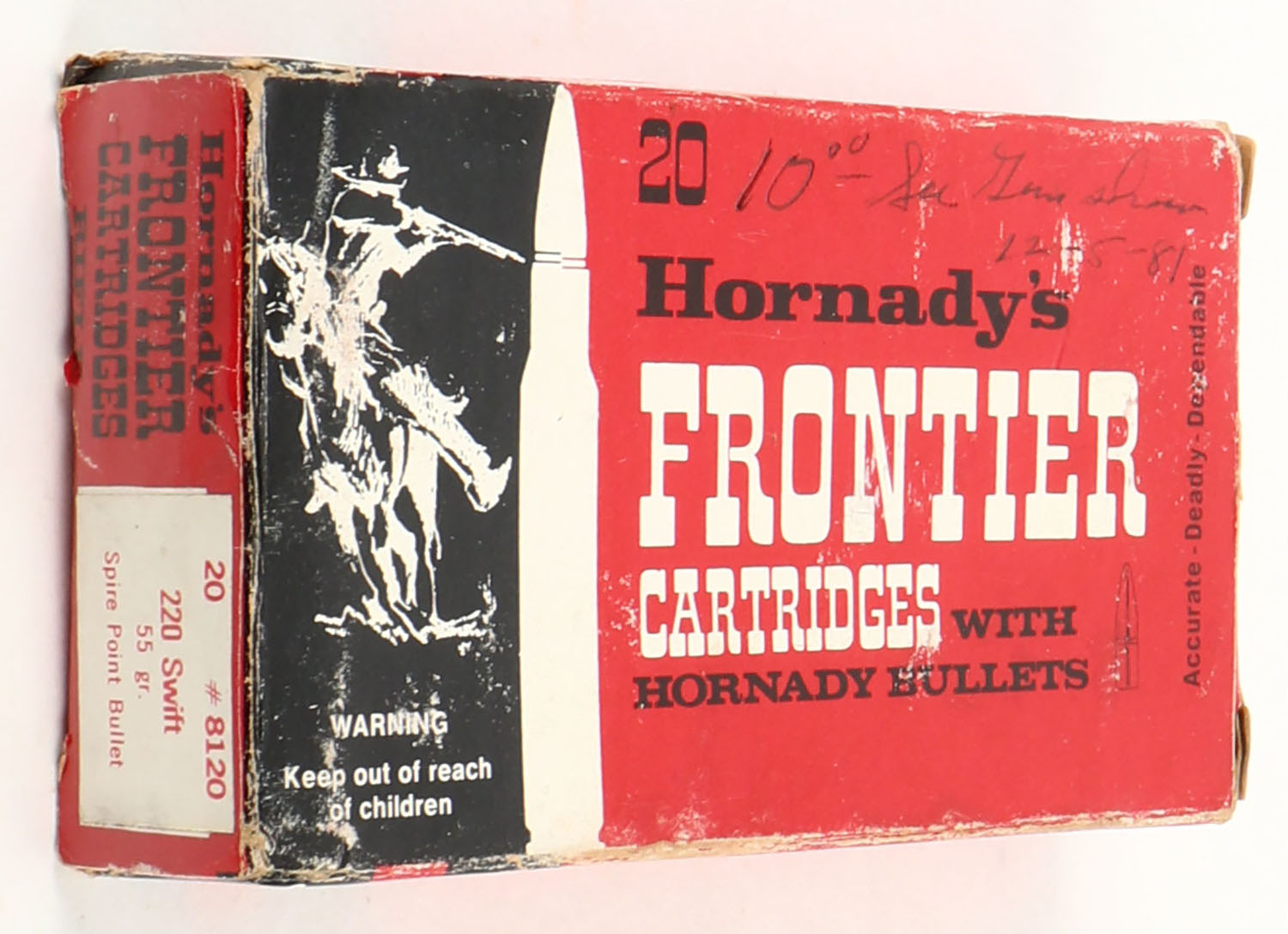 Hornady, Frontier, 220 Swift, 55 Grain Spire Point, Partial 19rds. With 8rds being correct, 1pc, multi-colored box, box has age soiling with scuffing, ammo is good. Grade: Good ++ - Value: 8 to 40