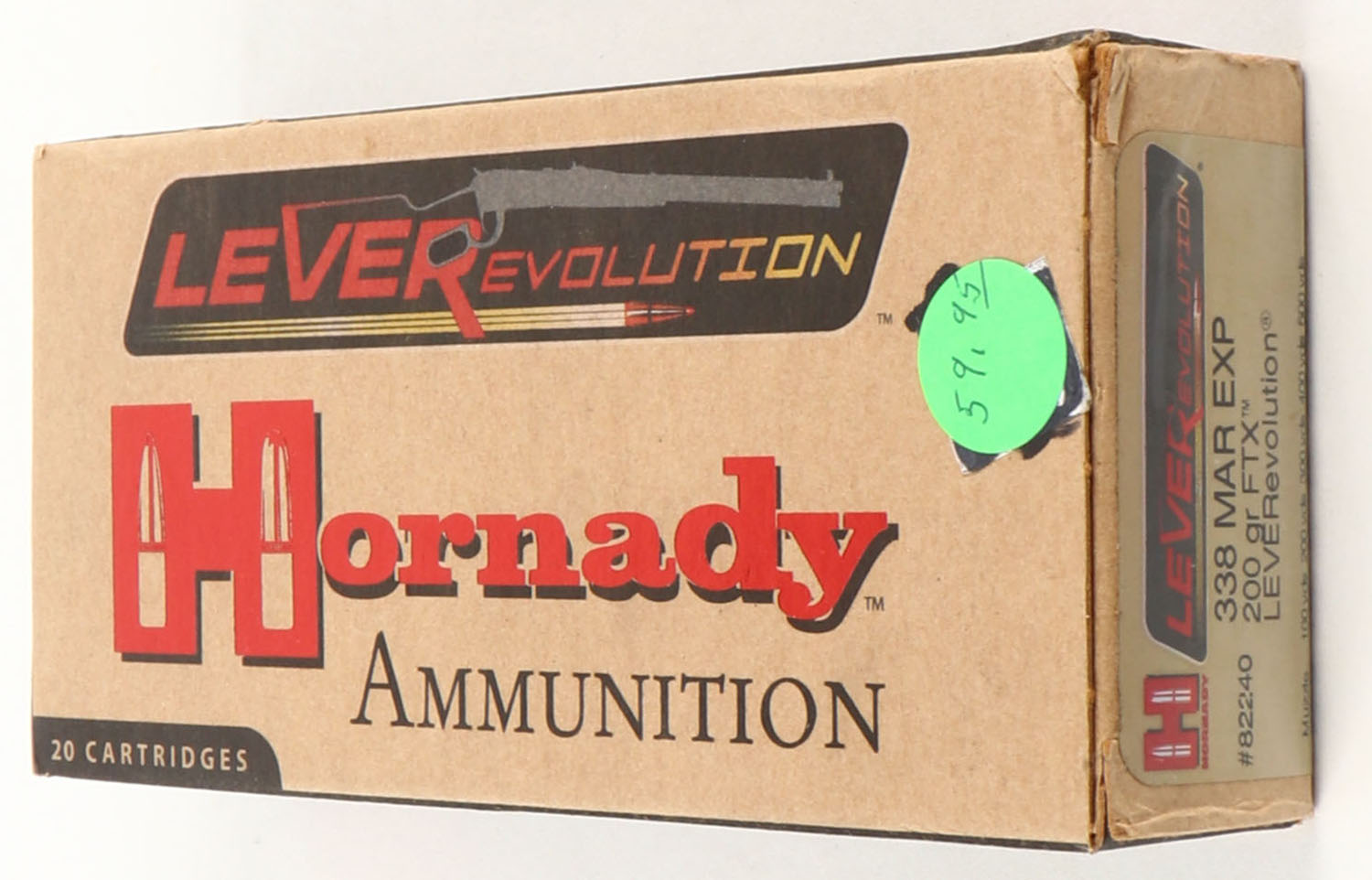 Hornady, LeverEvolution, 338 Mar EXP, 200 Grain FTX, Full, 1pc. multi-colored box, box is solid with excellent color, Ammo is minty. Grade: Excellent + - Value: 20 to 60