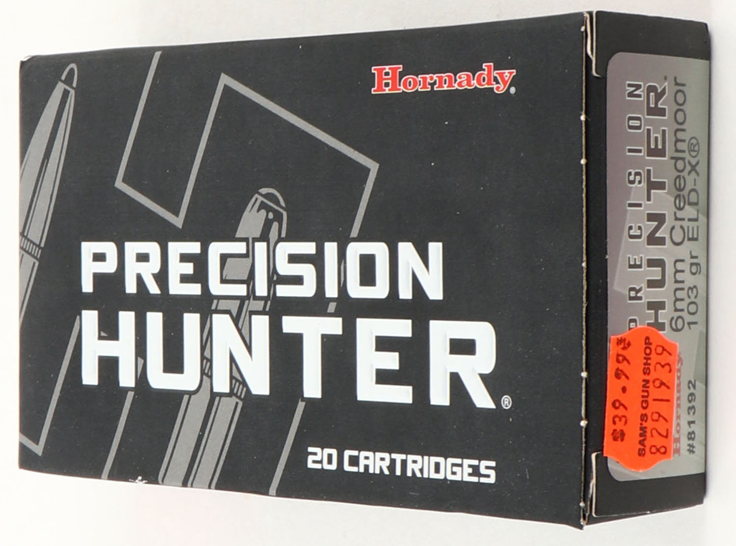 Hornady, Precision Hunter, 6mm Creedmoor, 103 Grain ELD-X, Full, 1pc. multi-colored box, box is solid with excellent color, Ammo is excellent. Grade: MINT - Value: 16 to 60