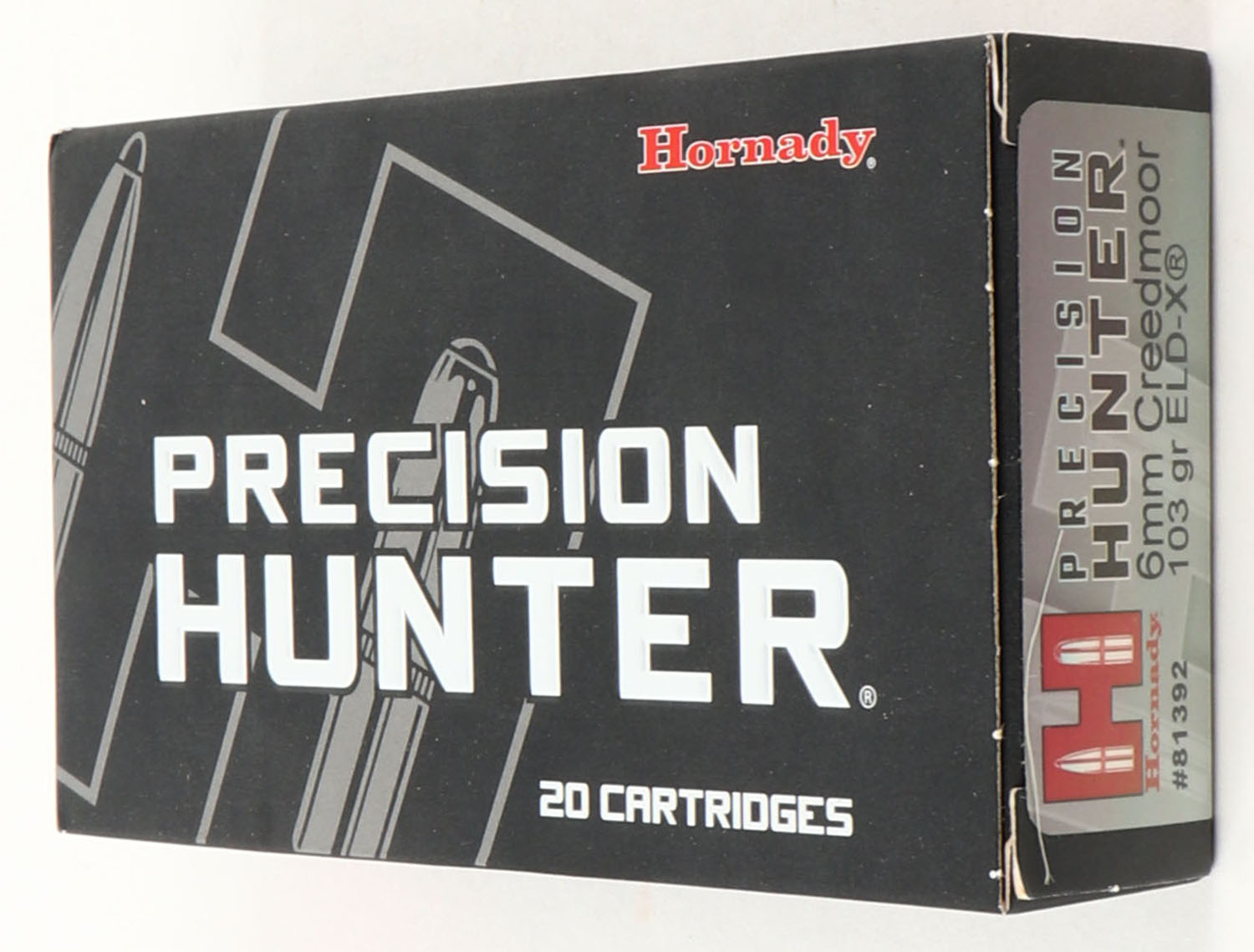 Hornady, Precision Hunter, 6mm Creedmoor, 103 Grain ELD-X, Full, 1pc. multi-colored box, box is solid with excellent color, Ammo is excellent. Grade: MINT - Value: 16 to 60