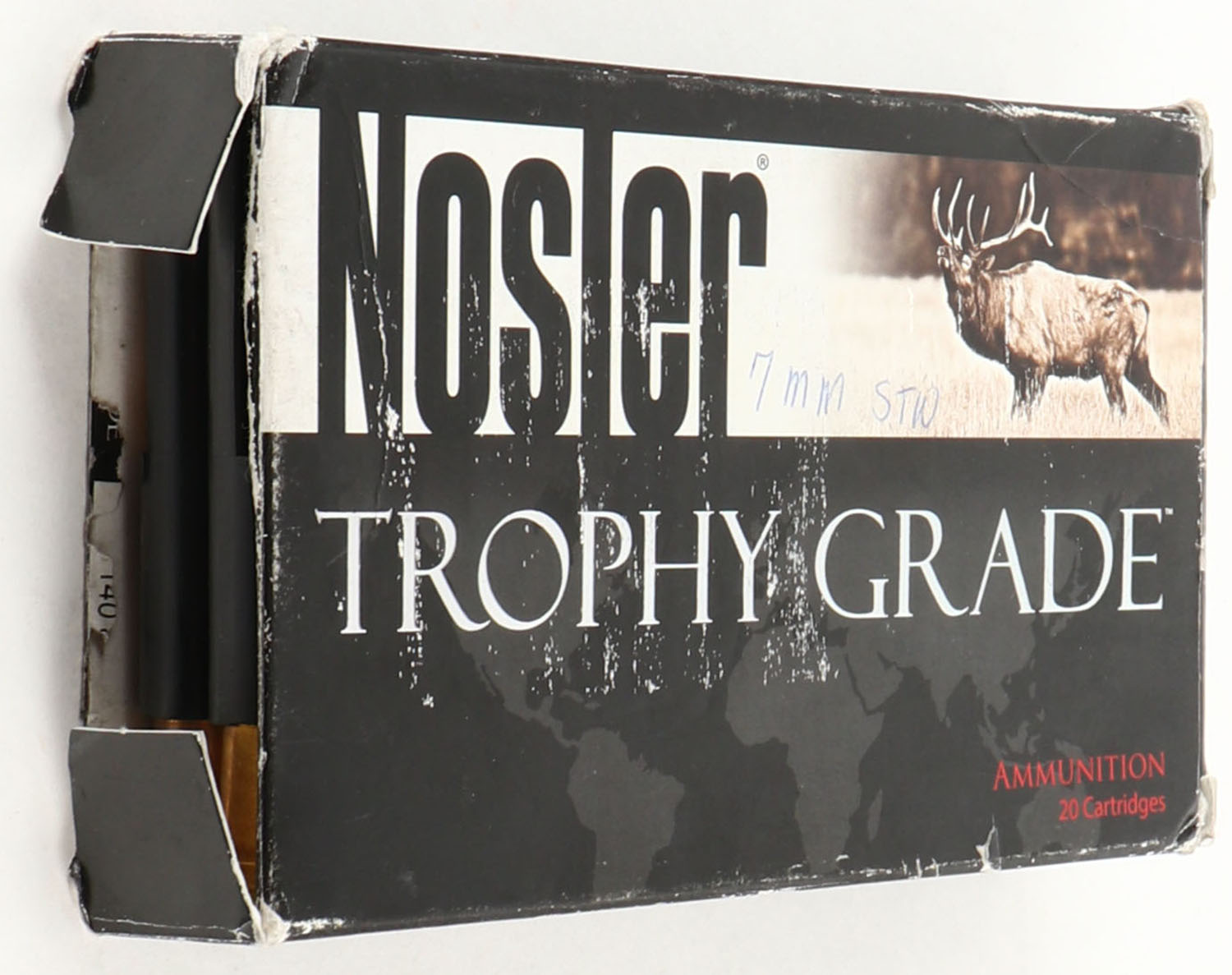 Nosler, Trophy Case. 7mm STW, 140 Grain, Full, 1pc, multi-colored box, box has missing torn end flap and has edge wear, ammo is excellent. Grade: Very Good - Value: 20 to 80