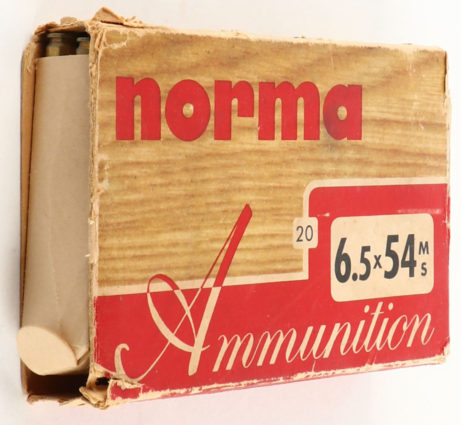 Norma, 6.5 x 54 MS, 156 Grain Soft Point RN, Full with 11rds being correct, 1pc. Multi-colored box, box has missing end flaps with age soiling, ammo is good. Grade: Good - Value: 10 to 40
