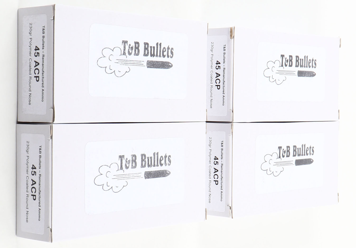 T&B Bullets, Lot of (4), .45 ACP ammo boxes, Remanufactured Ammo by a class type 7 Ammo MFG (this is the same class (high quality) as Winchester, Federal and or CCI), 230 Grain Polymer Coated Round Nose bullet, loaded cartridges, 1pc, Full 50 count boxes, white boxes are very solid, ammo is minty. Grade: Excellent ++ - Value: 20 to 100