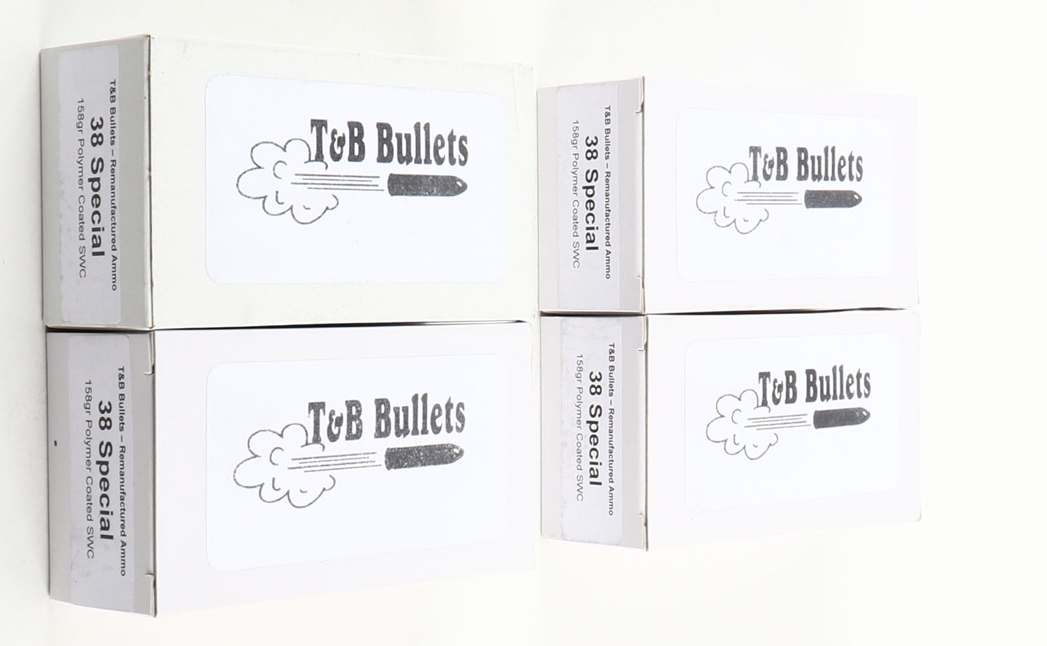 T&B Bullets, Lot of (4), .38 Special ammo boxes, Remanufactured Ammo by a class type 7 Ammo MFG (this is the same class (high quality) as Winchester, Federal and or CCI), 158 Grain Polymer Coated SWC bullet, loaded cartridges, 1pc, Full 50 count boxes, white boxes are very solid, ammo is minty. Grade: Excellent ++ - Value: 20 to 100