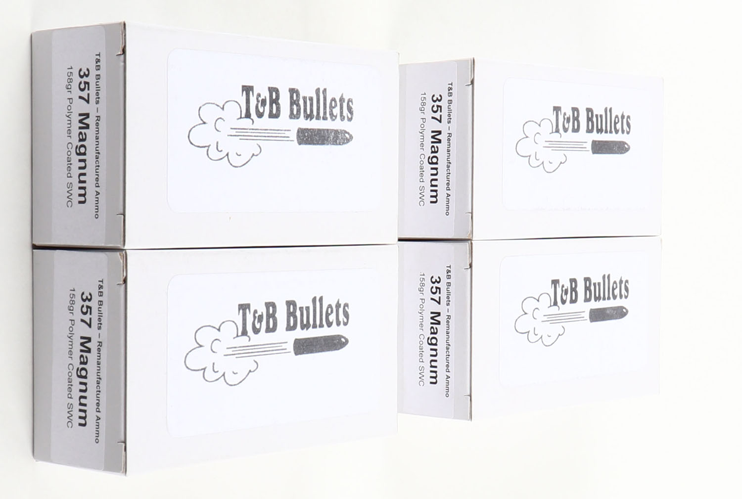 T&B Bullets, Lot of (4), .357 Mag ammo boxes, Remanufactured Ammo by a class type 7 Ammo MFG (this is the same class (high quality) as Winchester, Federal and or CCI), 158 Grain Polymer Coated SWC bullet, loaded cartridges, 1pc, Full 50 count boxes, white boxes are very solid, ammo is minty. Grade: Excellent ++ - Value: 20 to 100