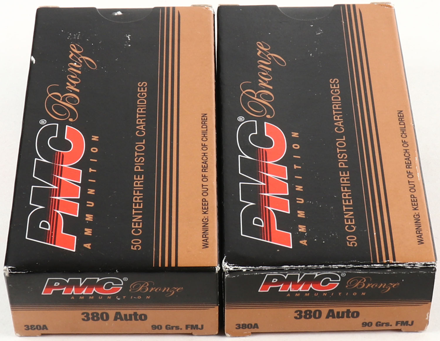 PMC Bronze, Lot of (2), 380 Auto, 90 Grain FMJ, Full, 1pc, boxes are very solid, ammo is excellent. Grade: Excellent + - Value: 20 to 60