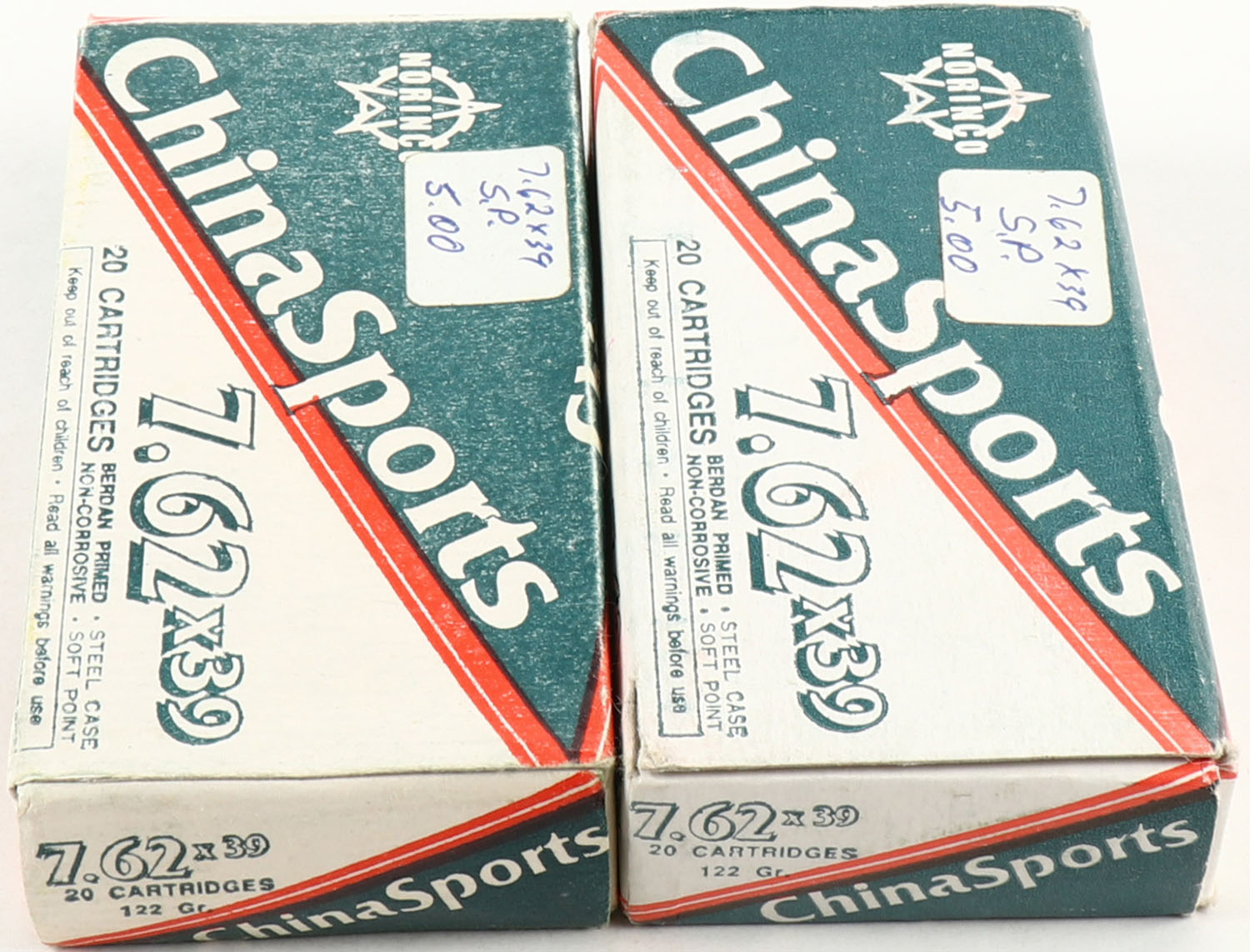 Norinco, Lot of (2), China Sports, 7.62 x 39, 122 Grain, Full, 1pc, multi-colored boxes, boxes are solid with light scuffing, ammo is excellent. Grade: Excellent - Value: 10 to 40