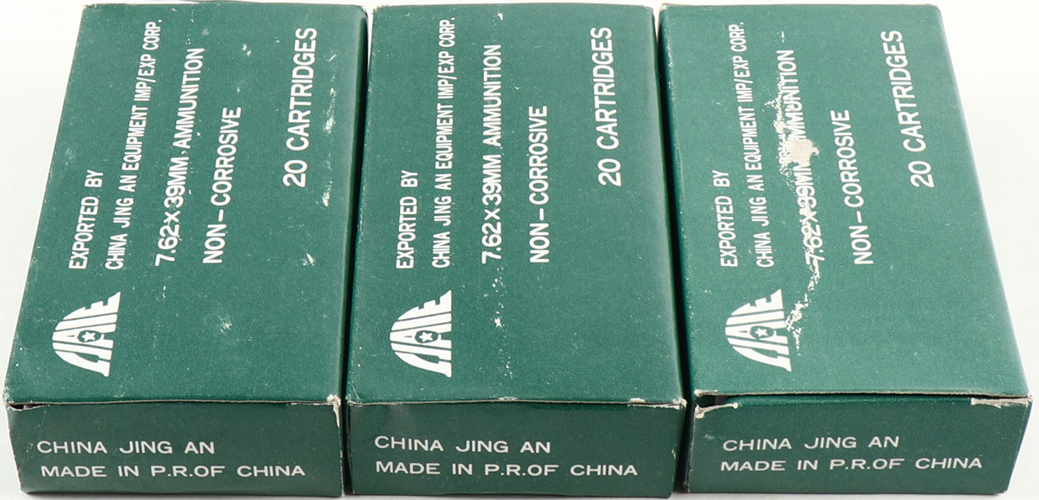 China Jing, Lot of (3), 7.62 x 39mm, Full, 1pc. Green boxes, boxes are solid with excellent color, ammo is minty. Grade: Excellent + - Value: 16 to 60