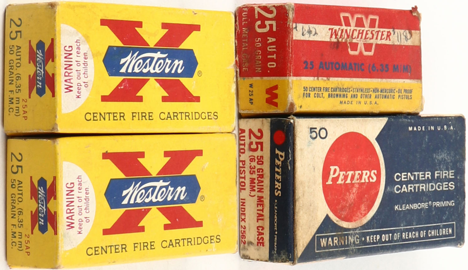 Mixed Mfg., Lot of (4), .25 Auto., Peters box is partial 20rds, Winchester box is Full of mixed H/S, Western box is partial 20rds, Western box is partial 21rds, boxes have scuffing, ammo is very good. Grade: Good ++ - Value: 10 to 60