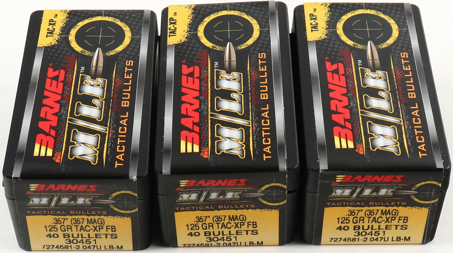 Barnes, Lot of (3), 357 Mag., 125 Grain TAC-XP FB, FULL & SEALED, 1pc, plastic boxes are minty. Grade: MINT - Value: 20 to 60