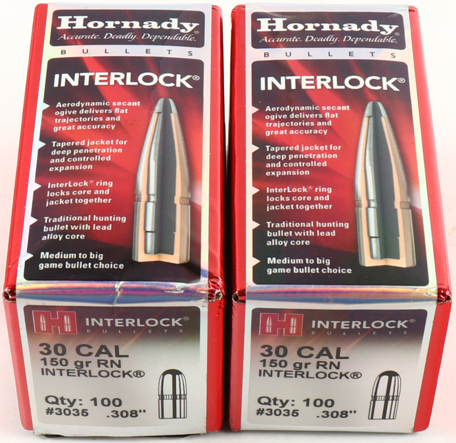 Hornady, Interlock, .30 Cal, 150 Grain RN, .308'' Dia., Full, 2pc, boxes are very solid with excellent color, bullets are excellent. Grade: Excellent ++ - Value: 20 to 80
