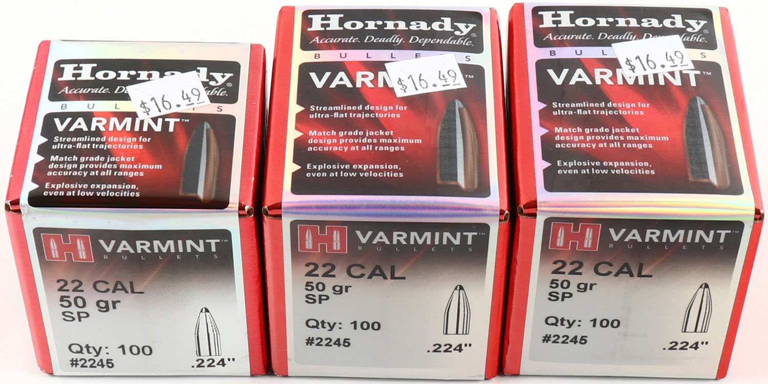 Hornady, Varmint, Lot of (3), .22 Cal., 50 Grain, SP, .224'' Dia., FULL & SEALED, multi-colored boxes, boxes are minty. Grade: Excellent ++ - Value: 20 to 60