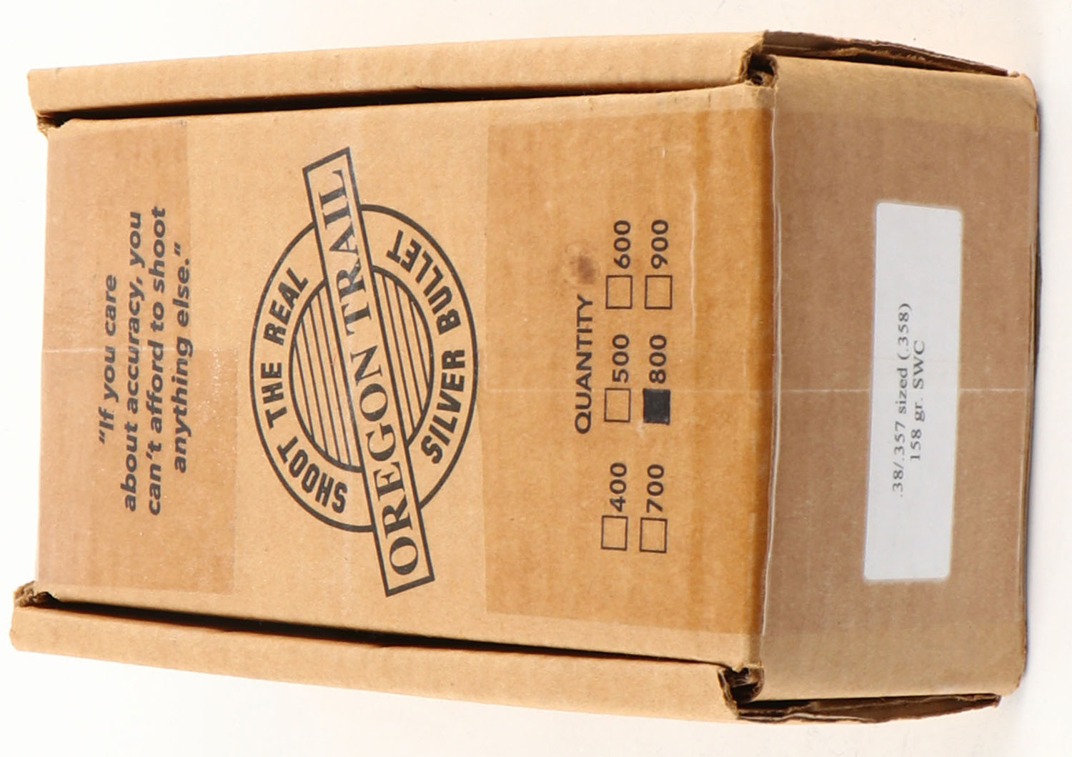 Large lot of Oregon Trail Bullets, .38/357 sized (.358), 158gr, SWC, box appears full and displays 800 ct. Grade: Mint - Value: 40 to 120