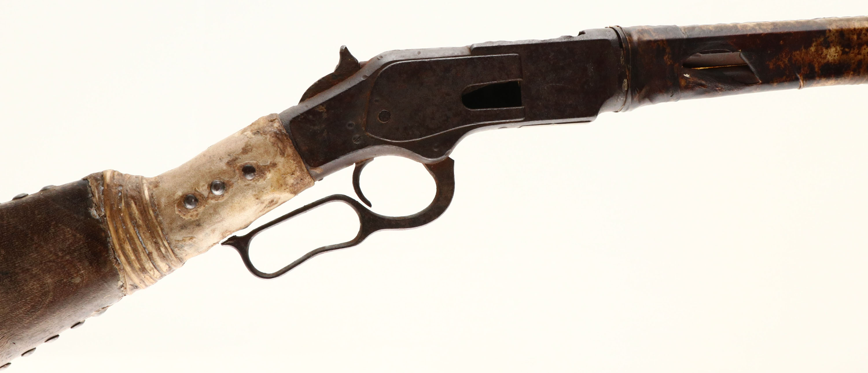 EARLY Winchester, Model 1873, 1st model, .44 WCF Cal., MFG: Antique, SN: N/A, Lever Action Rifle, 24'' Octagon barrel, 3/4'' mag. The is an early first model 1873. The serial number is not visible due to raw hide coverage. However, based on the shape of the lever, dust cover & concealed trigger pin, the rifle was made before 1876. The rifle is not in operational condition, rather it is a wonderful relic of an era gone by. The rifle sold decades ago in a California auction & was previously part of the John Beckwith collection. The rifle is heavily rusted & the action no longer moves. The lever is bent & the top of the hammer was broken long ago during use. The side rails of the frame where the dust cover once slide, shows prying & distress from hand ejection of cartridges. It is missing the loading gate & the mag tube appears to have been shortened to 3/4 length. It has no rear sight & an altered front blade sight. The raw hide wrapping on the center portion of the barrel & mag appears to be extremely old, showing sinew threads of an early Indian period (previously identified as from the 1870's). The hide on the muzzle end slightly later. The hide wrapped at the wrist is of a thicker hide, which was likely necessary to support a break at the wrist & is possibly from a later period. The original buttstock is sun bleached & very weathered. The buttplate is missing, which was very common to Indian owned rifles of this vintage, as most were removed to make hide scrapers for buffalo & other game. The stock carries corroded & well weathered iron tacks. A few are broken off or missing & show a square steel shank, correct to the period. The Indians were known to have repeating rifles at the Battle of Little Big Horn & this being a 1st model probably pre-dating 1876, it's a rifle that was of that era & makes for a great story. Antique, No FFL Req. - Value: 2000 to 4000