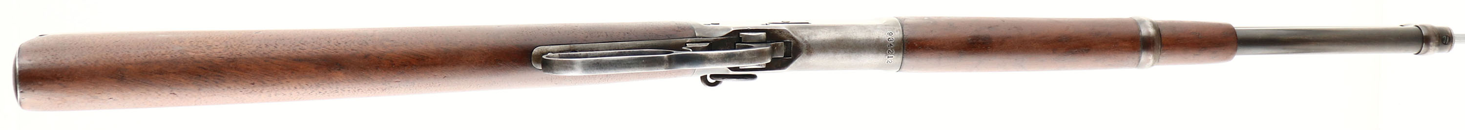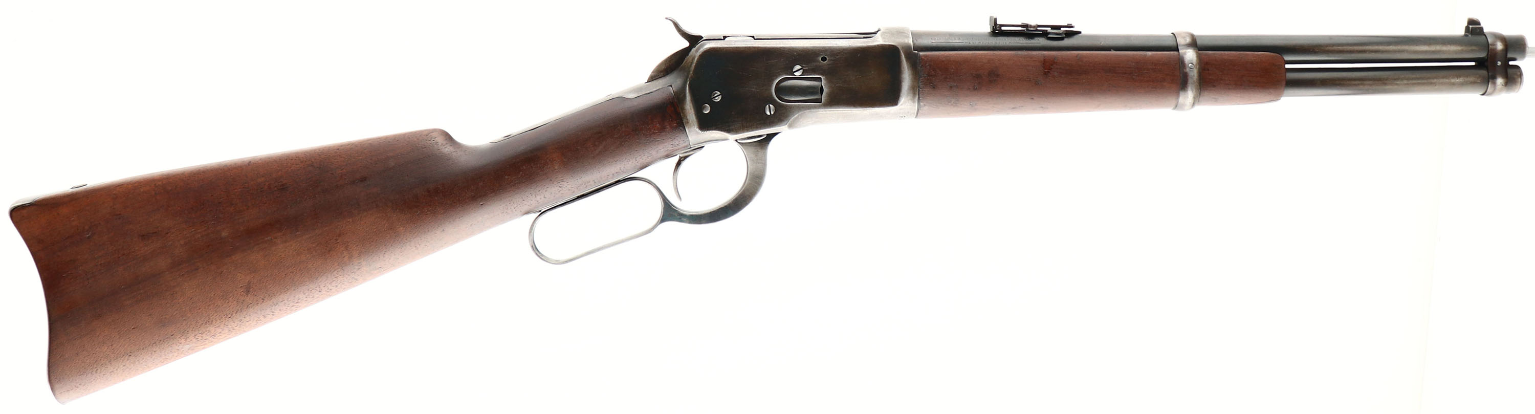 VERY RARE Winchester, Model 92 SRC TRAPPER, marked 44 WCF, MFG. 1924, SN: 934212, Lever Action Rifle, 14'' Round TRAPPER barrel, Full mag. The original stocks are very good & solid. The forend is the shorter 8'' trapper length. The stocks have a flat finish appearance, having been cleaned, lightly sanded & refinished. There is a 1/4'' contusion fill on the right side edge of the forearm, a corner edge fill at the lower right corner of the wrist & a couple of very small edge fills on the right side wrist against the receiver, all of which match well & are not distracting. The is a 1 1/2'' tight hairline crack at the bottom of the forend tip & a small contusion on at the left wrist against the receiver. There are a few other minor blemishes, giving the wood a very nice overall appearance. The factory metal blue has worn thin, but there remains areas of original blue on the barrel, receiver, mag tube & lever, which is quite rare amongst trappers as most are worn silver or are brown guns. The balance of the metal is a mix of thin brown patina & areas worn to silver. The bore is excellent, bright & clean, with strong rifling. Fitted with standard factory carbine flip-up rear ladder sight & blade on box front sight. The stock carries a steel carbine buttplate. Original saddle ring on left side This Trapper is listed with the ATF by SN as an exempt trapper rifle. This is your opportunity to purchase a very rare 14'' Trapper in above average condition. Truly a wonderful little 92 Trapper in the highly preferred 44 WCF. FFL or C&R Req. - Value: 8000 to 12000