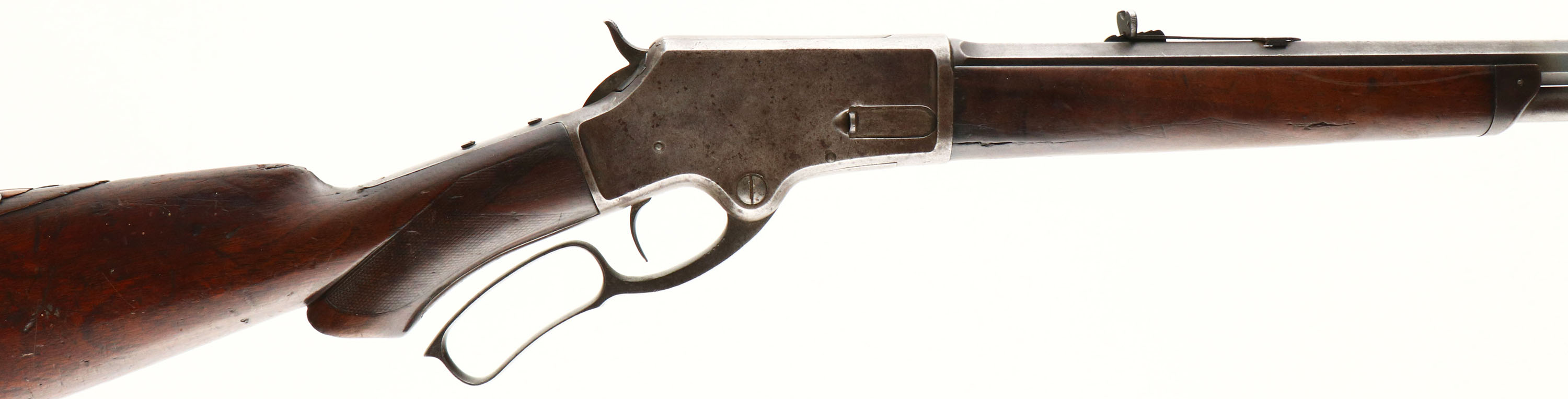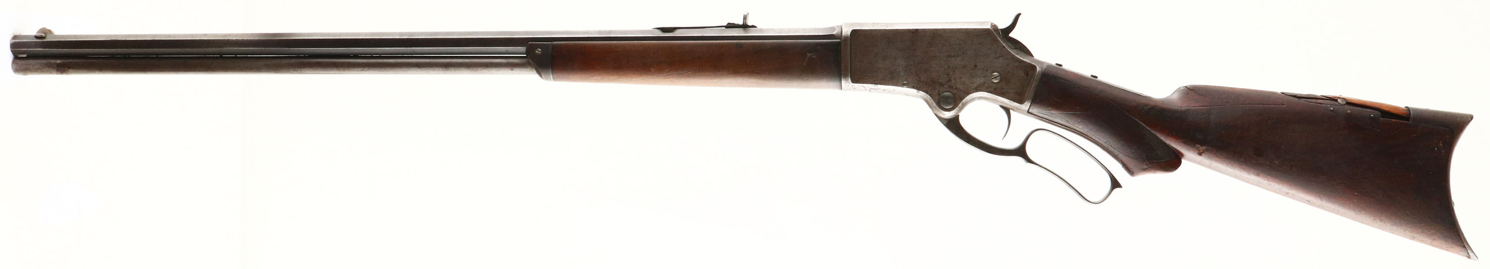 Marlin, Model 1881 Deluxe, marked 38-55 Cal., MFG. 1886, SN: 13294, Lever Action Rifle, 28'' Octagon barrel, Full mag. The original deluxe checkered & scalloped pistol grip wood stocks are fair. Much of the original checkering has smoothed due to heavy use. The forearm has a 2 1/2'' crack to the lower right side. The stock has a large 4'' broken chunk along the back of the comb, which has a few chunks nailed back into space, both original wood & an additional lighter toned piece of wood. There are numerous small scrapes, scratches & contusions. The metal surfaces have worn mostly gun metal gray, with a mix of spotty thin brown patina & remnants of original blue, mainly on the lower flats of the barrel. The receiver upper tang previously held a tang sight, with mounting screws remaining. Barrel carries an adjustable rear sight, with a replaced elevator & a Lyman half moon blade front sight. There are a couple of dents in the mag tube 1 1/2'' from muzzle. Bore is good, with some roughness amongst strong rifling. Stock carries a crescent metal buttplate. There is an open hole in front of the trigger under the lever. e action remains tight & smooth. The rifle has a well worn Old West esthetic & is an early era deluxe lever. Antique No FFL Req. - Value: 500 to 1000