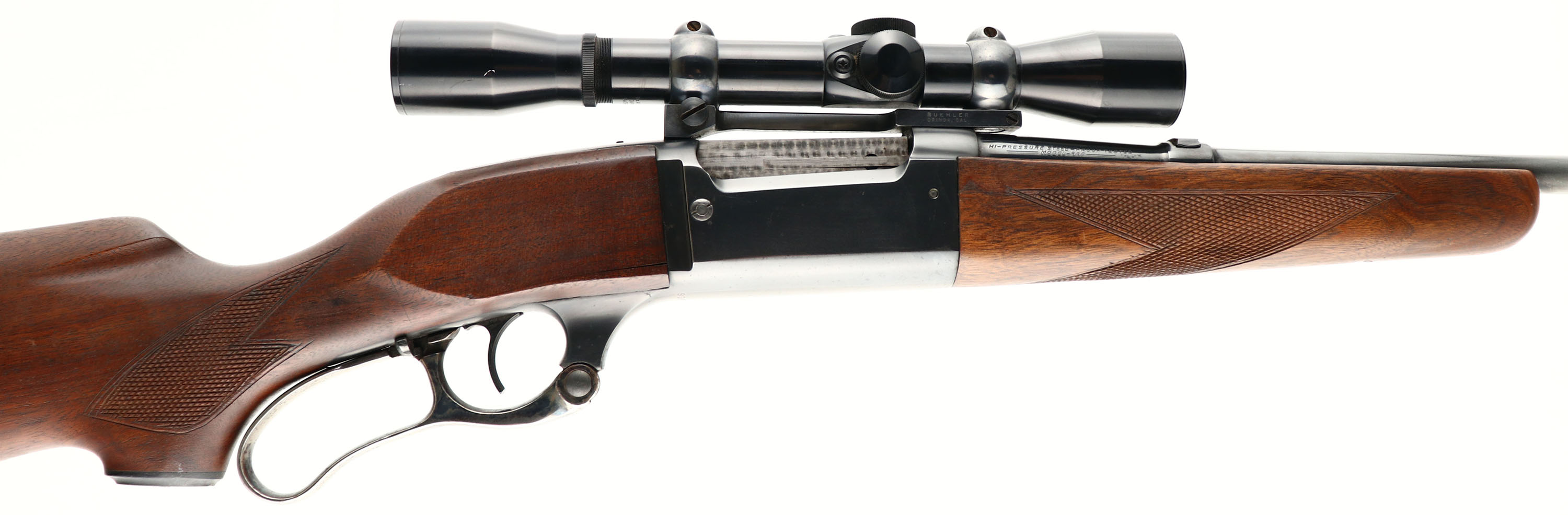 Savage, Model 99, CAL: 308 WIN, MFG: 1957, SN: 938111, Lever Action Rifle, 22'' round barrel. The original checkered & capped pistol grip wood stocks are very good & solid, despite a 2 1/2'' crack emanating from the end of the upper tang & 1 1/2'' stress crack along the lower edge of the right side of the wrist, coming off the receiver. There are a few scrapes, scratches light ding to the wood, with one larger contusion within the left side forend checkering. The original metal blue finish rates 90% on the barrel, 85% on the receiver. The case-hardened lever has faded mostly gun metal gray. Bore is excellent. The receiver carries a Bushnell ScopeChief 4x scope on Buehler mounts, while the barrel holds a blank in the rear dovetail & ramp elevated blade front sight. Grooved metal buttplate. Jeweled Bolt. Great overall appearance. FFL or C&R Req. - Value: 500 to 1000