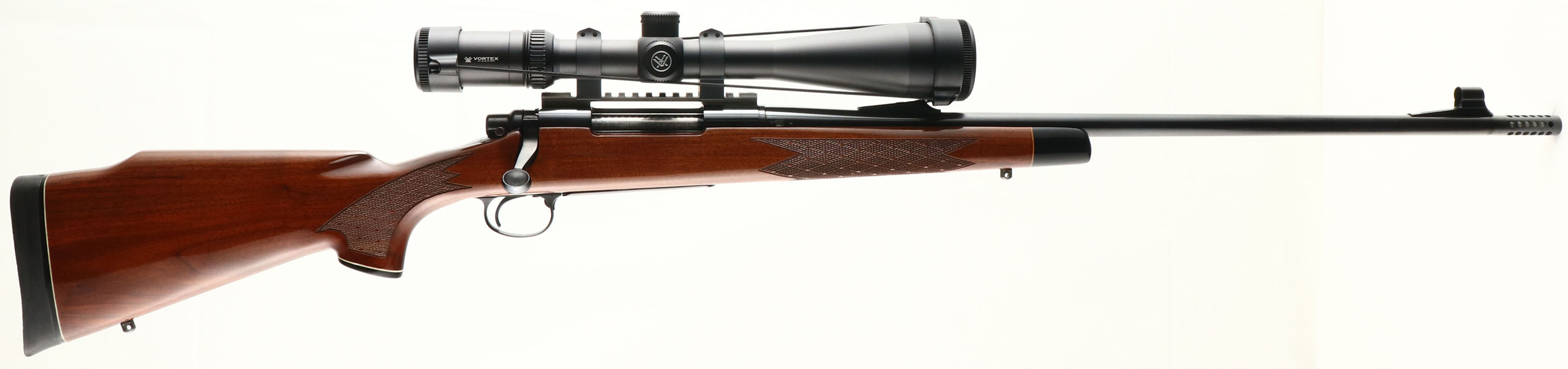 Remington, Model 700 , CAL: 8mm REM MAG, MFG:1979, SN: A6756808, Bolt Action Rifle, 24'' round barrel, 25 3/4'' with comp. The original cheeked, hand skip-line checkered & capped pistol grip Monte Carlo style wood stock is excellent, with just a couple of tiny handling marks to the original high gloss finish. The stock carries an ebony toned forend tip & plastic pistol grip cap. The original metal blue finish rates 98% overall. Bore is excellent. The receiver holds a Vortex Viper 6-24X50 scope mounted on a picatinny rail, while the barrel carries the rear ramp, but no sight & a hooded front sight. Stock carries a Remington solid recoil pad. Sling studs. An overall excellent condition rifle, with a high quality scope. FFL Req. - Value: 1200 to 1500