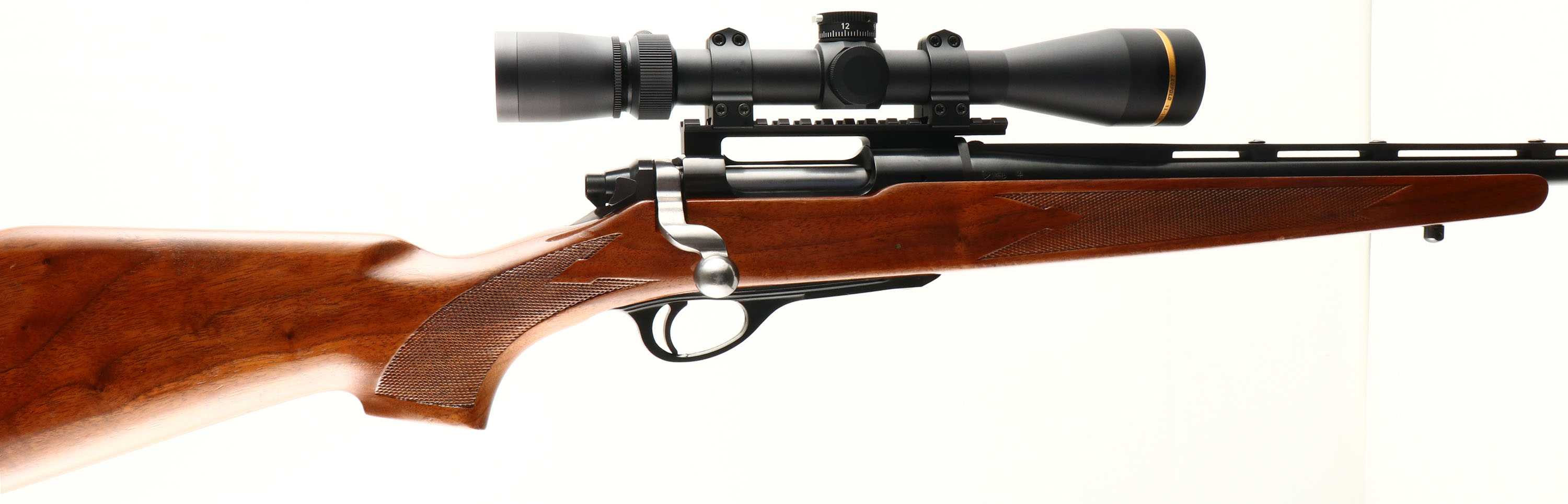 Remington, Model 600 Carbine, CAL: .222 REM, MFG: 1966, SN: 67521, Bolt Action Rifle, 18 1/2'' barrel. The original press checkered, raised comb & flat pistol grip wood stock is excellent, with a few small scuffs & contusions to the original finish. The metal blue finish rates 98% overall. Bore is excellent. The receiver carries a Leupold VX-3HD 4.5-14X40 Gold Ring scope mounted on a EGW REM 660 0MOA Picatinny rail. The rear sight has been removed from the ventilated rib, but it still carries the elevated blade front sight. Buttstock carries a Remington plastic buttplate. Dog leg bolt handle. Sling studs. A great little compact hunting rifle & nicely set up. FFL or C&R Req. - Value: 800 to 1200