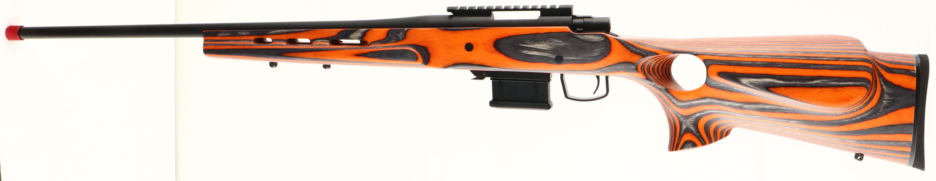Howa, Model 1500, CAL: 223 REM, MFG: Modern, SN: B663926, Bolt Action Rifle, 22'' 1-8'' barrel. The thumbhole & flat pistol grip, gray & orange laminated wood stock is excellent, with a few tiny handling marks to the original finish. The original metal black finish rates 98% overall. Bore is excellent. Muzzle: Threaded 1/2x28. The receiver is fitted with a picatinny rail & no open sight provisions on the barrel. Stock carries a Boyd recoil pad. Thumb Safety. Detachable mag. Sling studs. An excellent overall condition hunting rifle. FFL Req. - Value: 400 to 800