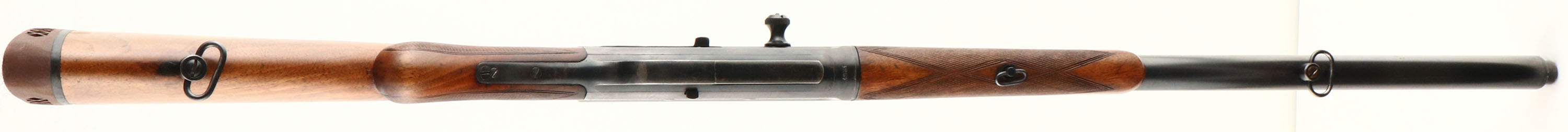 RARE FN (Fabrique Nationale), Modele 1900, .35 Rem Cal., MFG. 1926, SN: 4267, Semi-Auto Rifle, 22'' barrel, Made in Belgium & one of only 4,913 Modele 1900's produced. The rifle has the original English walnut round knob pistol grip stock & schnabel tip forend. The hand cut factory checkering is 20 lines-per-inch, with the late 3rd style forearm checkering pattern. The stocks condition is excellent, likely having been cleaned & reoiled. There are very few light handling marks or scuffs to the wood & finish. The checkering is very good, with some smoothing found mostly on the forend. The original metal blue finish is approximately 80% overall, with blue thinning at the edges & carry points & some minor scratches. The left side of the receiver carries the factory roll stamp & proof markings. Bore is very good. The solid barrel rib runs the length of the jacket & is fitted with the original two position flip box rear sight & front blade sight dovetailed into the barrel rib. The back of the receiver has two open holes where it appears a Redfield tang/receiver sight may have once been mounted. Stock has been cut to fit a Pachmayr ventilated recoil pad. Replaced sling loops. Tight action & functions as it should. A very nice late production example of this rare & highly collectible rifle. FFL or C&R Req. - Value: 2500 to 3500