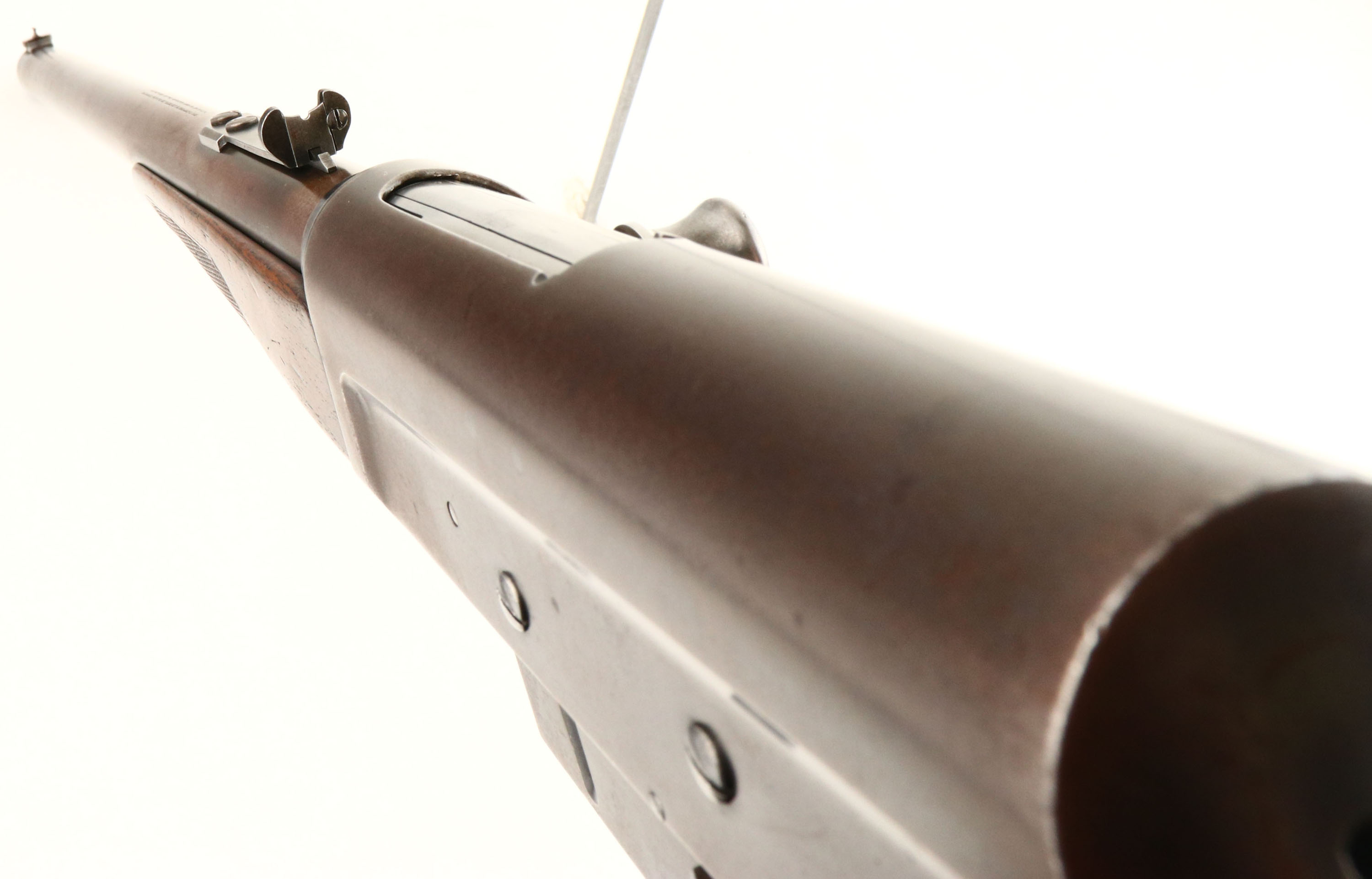 Remington, Model 8C (Deluxe), marked .32 Rem Cal., MFG: 1909, SN: 16907, Semi-auto take-down rifle, 22'' barrel, The original deluxe checkered & round knob pistol grip wood stocks are excellent & solid. The inside of the forend is stamped with a 3 for grade ''3'' or ''C'' grade, & they display hand checkering cut at 20 lines per inch. Being an earlier production rifle & a C grade, the stock carries the cheeks at the wrist. There are minor scrapes, scratches & contusions to the original finish. There are two thin & tight grain or stress cracks emanating from the upper tang & running rearward. The original metal blue finish is toning to a thin brown patina, with mostly full coverage. Some area have worn gray, while other areas retain darker blue finish. The receiver has an open factory hole from previous tang sight, while the barrel carries an adjustable rear & standard front sight. Bore is very good, clean & bright. Stock carries the Remington plastic buttplate. 5 rd fixed magazine. Tight action. A rare & very nice original ''C'' grade deluxe rifle, which is very collectible. FFL or C&R Req. - Value: 2000 to 3000