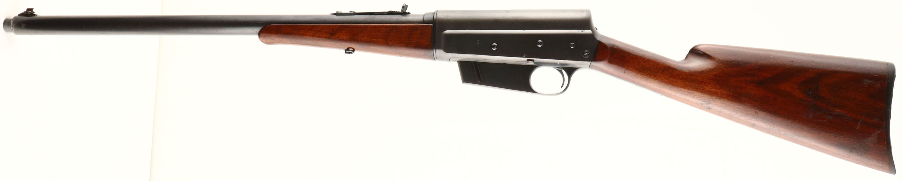 Remington, Model 8, .25 Rem Cal, MFG. 1912, SN: 29092, Semi-Auto Rifle, 22'' barrel. The original straight grip & schnabel forend stocks are excellent, with both appearing to carry the original finish, with a layer of added finish over the original. There are minor scuffs, scratches & contusions to the wood, & several larger scrapes to the lower half stock, mainly on the left side. The original metal blue finish rates 90% on the receiver, 85% on the barrel. Bore is good. Barrel is fitted with standard adjustable rear & blade front sights. Buttstock carries a Remington UMC plastic buttplate. 5 round fixed magazine. Tight action. The safety lever has some issues & doesn't always allow for trigger pull when open & won't always close into safety position either after pulling the trigger or before. We strongly recommend this rifle visit a gunsmith or knowledgeable repair individual to adjust or repair the issue before attempting to fire rifle. This is one of the rarer calibers & other than repair issue, a nice looking rifle. FFL or C&R Req. - Value: 600 to 800