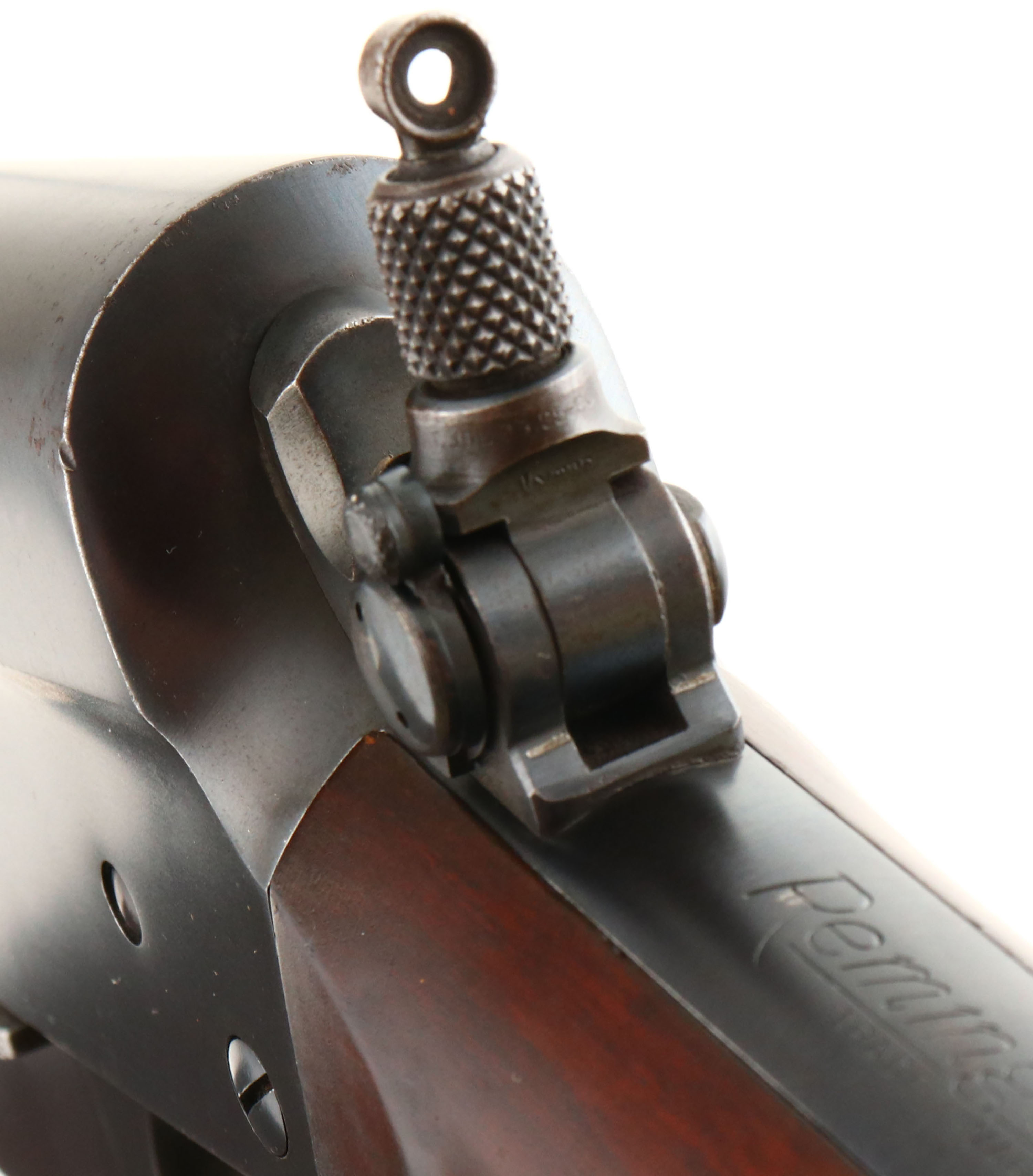 Remington, Model 8, .35 Rem Cal, MFG. 1916, SN: 38092, Semi-Auto Rifle, 22'' barrel. The original straight grip & schnabel forend stocks are very good to excellent. The stock has been cleaned or possibly lightly sanded, & refinished. The forearm carries the original finish, with a thin added layer of finish. There are several minor to small scuffs, scratches & contusions to the wood & finish. The original metal blue finish rates 80% overall, with the finish on the mag & safety lever toning a plum/brown. Bore is excellent. The receiver carries a Lyman tang sight, while the barrel carries a standard adjustable rear sight & Marble Sheard elongated blade front sight. Stock carries the rarely found checkered reverse teardrop Remington UMC metal buttplate. 4 round fixed magazine. Tight action. An excellent looking & nicely configured rifle. FFL or C&R Req. - Value: 600 to 1000
