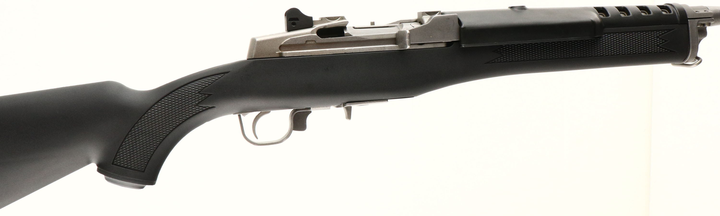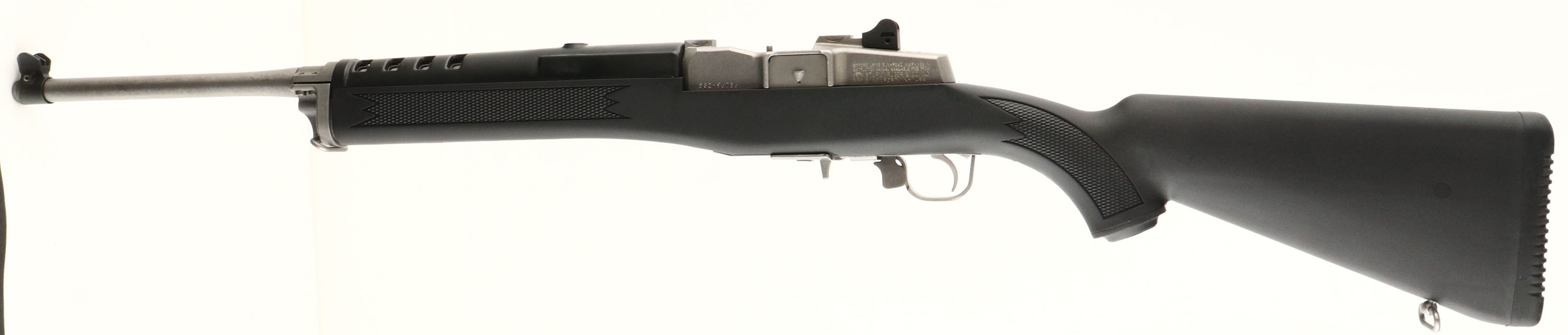 BOXED Ruger, Model Mini 14 Ranch Rifle, .5.56mm Nato (.223) Cal., MFG: 2014, SN: 582-96736, Semi auto rifle, 18 1/2'' barrel, The black synthetic checkered stock is near mint, The stainless metal is near 100%, Bore is excellent, Factory sights & sling loops. Original flush detachable mag. Came from inventory of closing gun store. Comes in a Ruger factory box, with factory paperwork & Ruger lock. Near mint rifle & a lot of fun to shoot. FFL Req. - Value: 800 to 1200