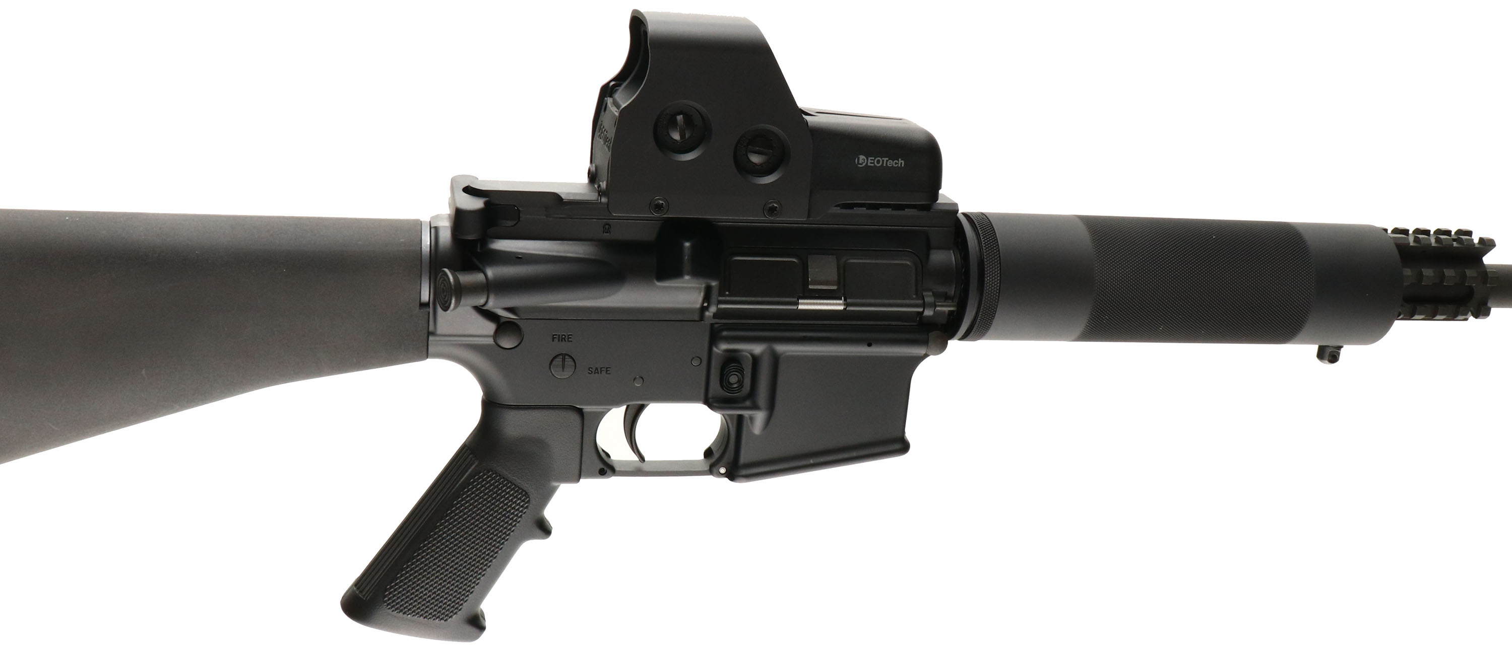 Bushmaster, Model XM-15-E2S, CAL: 450 Bushmaster BFI MFG: Modern, SN: BFI 535941, Semi Auto, 16'' M4 barrel, 18'' when including the muzzle brake. Upgraded with a fixed M16 A2 composite stock with buttplate storage compartment access. Also upgraded with a 7 1/2'' steel finely checker textured barrel forend. Both stock & forend are excellent. The original metal black finishes rate the full 100%. The receiver carries an elevated picatinny rail, while in front of the forend is a tri-rail picatinny rail fixture. The receiver rail carries a 500 series L3 EOTECH HWS holographic sight, functions properly but needs new batteries. Excellent bore. Upgraded muzzle brake. Sling stud & loop. No mag. Overall excellent. FFL Req. - Value: 600 to 1200