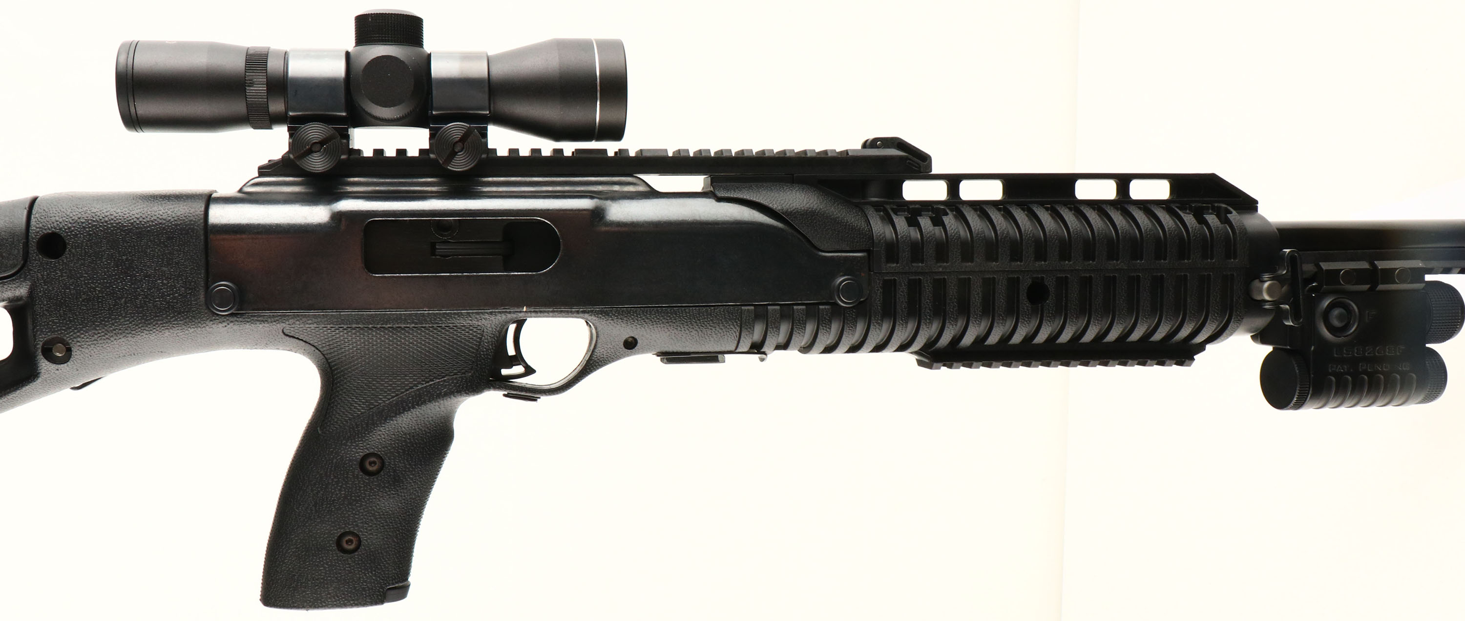 Hi-Point, Model 995, 9mm Cal., MFG: Modern, American-made firearm. SN: E76903, Semi auto rifle, 16.5'' barrel, The black all-weather molded polymer skeletonized stock & pistol grip are excellent. The original black metal finish rates 95%, with some light speckling. Bore is excellent, The receiver 10'' picatinny rail is mounted with an Aim 4X30 scope on Weaver mounts, while the front rail carries an AimShot LS8268 Green laser/flashlight, LOP adjustable buttplate/pad. Grip-mounted mag release. Comes with three mags, one flush mount, two extended. Sling swivels. Comes with the original AimShot flashlight box. A compact & rapid fire rifle. FFL Req. - Value: 300 to 500