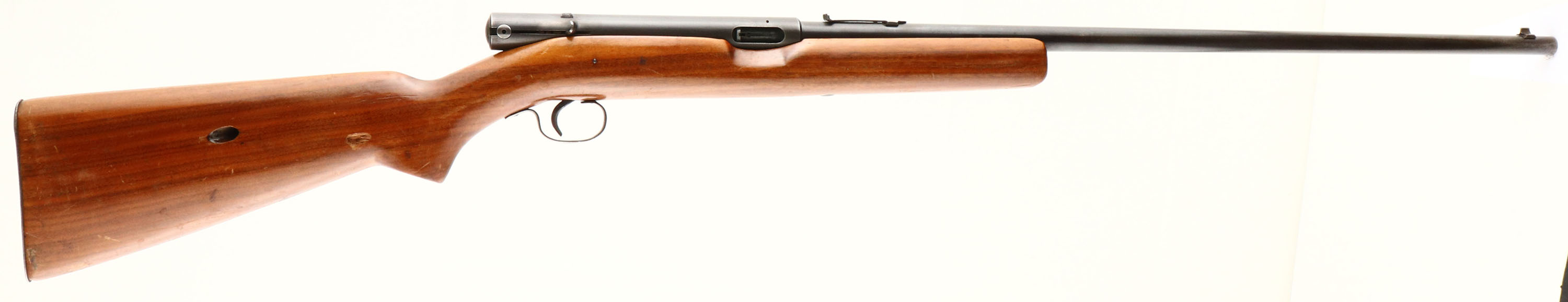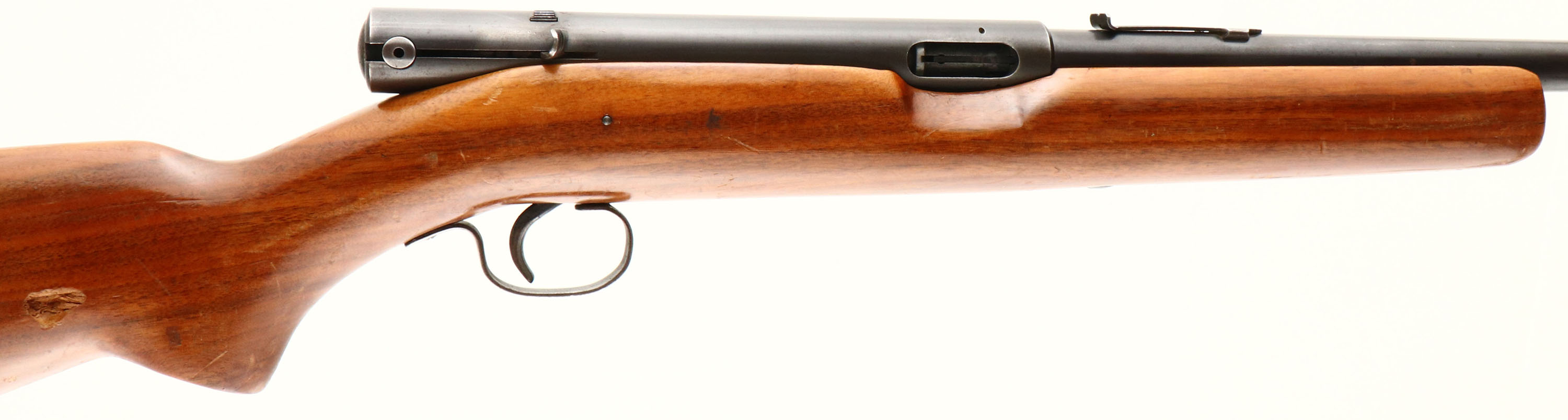 Winchester, Model 74, Marked .22 SHORT Cal., MFG. 1939, SN: 30020, Semi-Auto Action Rifle, 24'' round barrel. Tube mag fed through the buttstock. Collectors pay more for SHORT only variation & pre-WWII production. The factory flat pistol grip wood stock is good & solid, with several minor scrapes, scuffs & small contusions to the finish, along with one larger gouge on the right side of the stock behind the pistol grip. The original metal blue finish is thinning gray, with 60% coverage remaining on the barrel & receiver. The blue has mostly worn from the trigger guard. Bore is very good. Barrel carries an adjustable rear sight missing the elevator & standard front blade sight. Factory checkered metal buttplate. FFL or C&R Req. - Value: 150 to 300