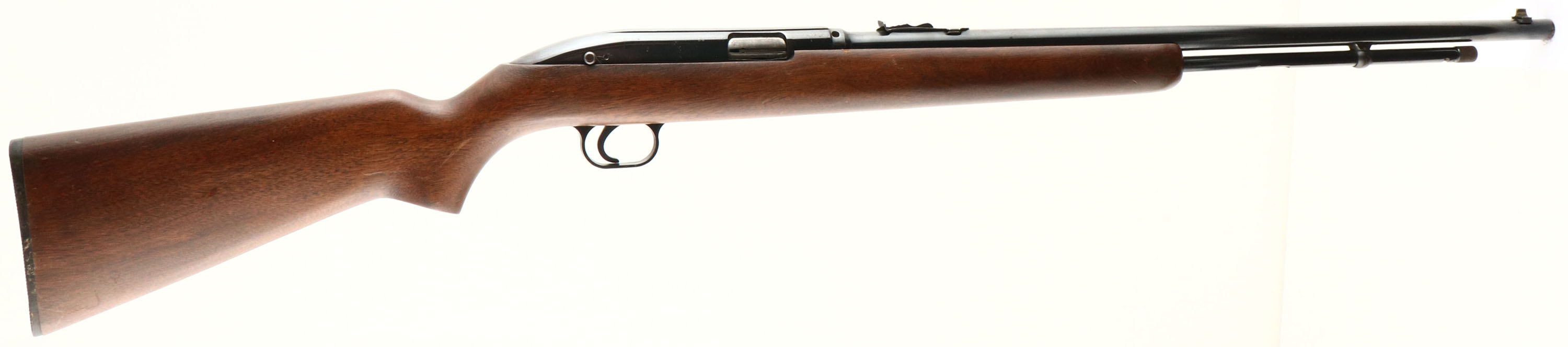 Winchester, Model 77, Marked .22 L. RIFLE Cal., MFG. 1955-62, SN: None, Tubular Mag Semi-Auto Rifle, 22'' round barrel. The original flat pistol grip wood stock is excellent, with several minor scratches & light contusions to the original finish. The original metal blue finish rates 85% on the barrel, 70% on the receiver, with some haze & speckling. Bore is excellent. Factory front & rear sights. Factory plastic buttplate. A nice Winchester semi- Auto .22. FFL or C&R Req. - Value: 200 to 400