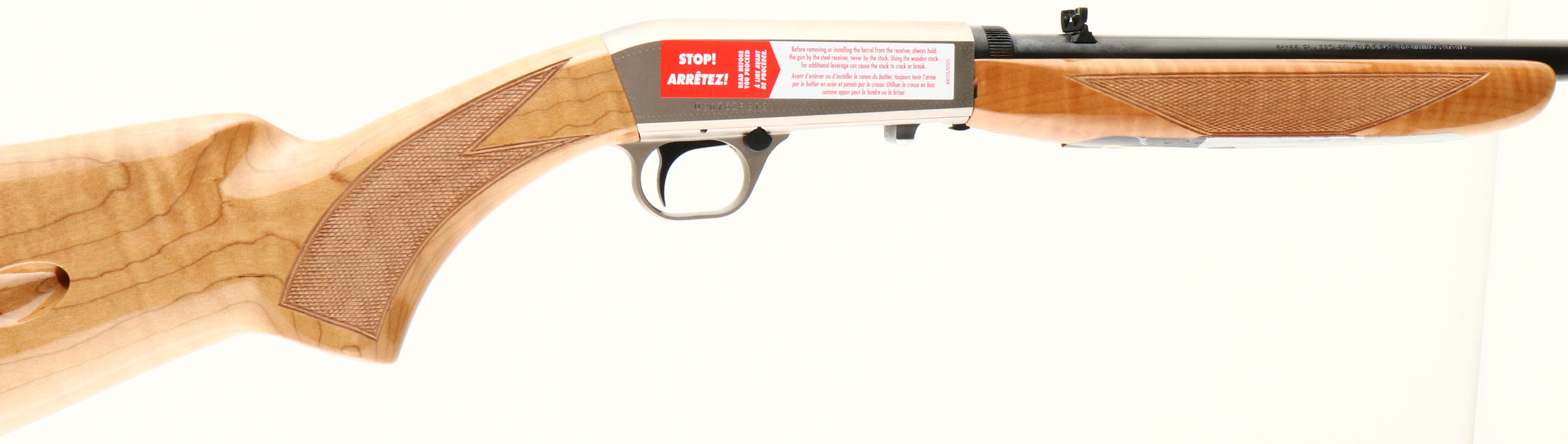BOXED Browning (Japan) Model SA-22 MAPLE, CAL: 22 L.R, MFG: 2018, SN:02076ZP212, Semi Auto Rifle, 19 3/8'' round barrel. The original checkered & flat pistol grip deluxe AAA maple stocks are excellent, displaying no defects to the high-gloss original finish. Checkering cut at 20LPI. The metal blue finish is 100% on the barrel, while the satin silver receiver is excellent. The receiver scroll & border engraving. Bore is mint. The barrel is fitted with factory folding rear sight & large blade style front sight. Metal buttplate. The receiver & forend still carry the retail & warning stickers. Comes in a correctly labeled box, with lock & brochure. Essentially a New Old Stock Rifle. FFL Req - Value: 800 to 1000