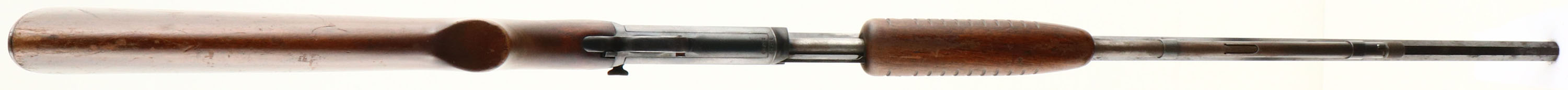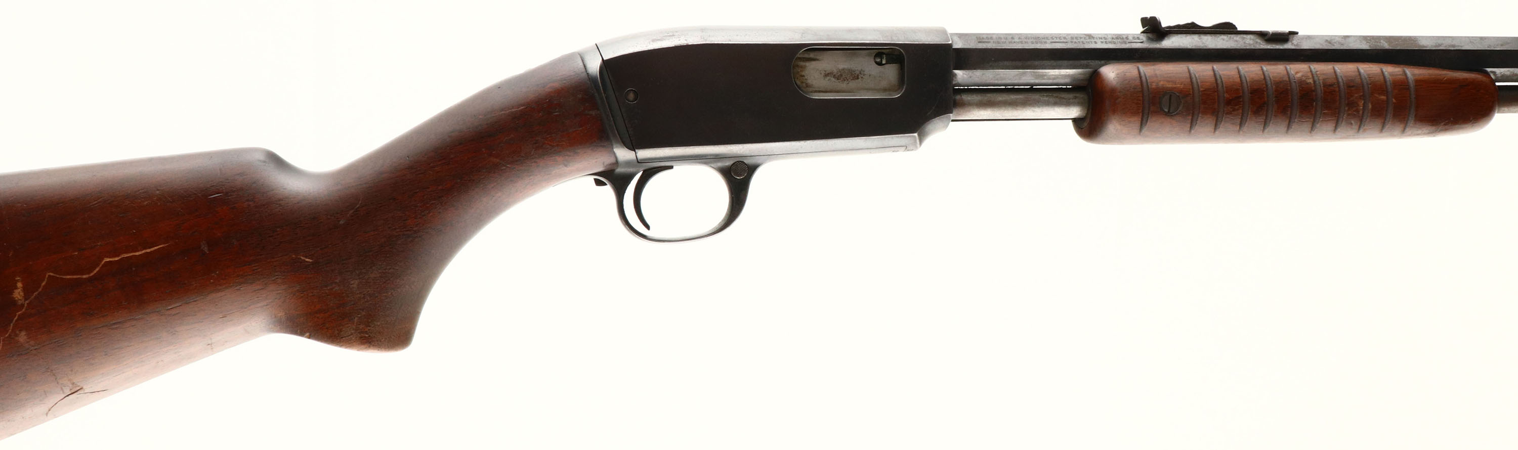 Winchester, Model 61, Marked .22 LONG R. Cal., MFG: 1937 (Pre-War), SN: 35299, Pump Action Rifle, Rare 24'' Octagon barrel. Rarer single caliber configuration. The original flat pistol grip wood stock & forearm are very good. The original finish is very good, with numerous small scratches, scrapes & contusions to the original flaking finish. Has the early production small corncob forearm, with the flat belly & tapered tip. The original metal blue finish is starting to gray, with 70% coverage on the barrel & receiver, 30% on the mag tube, with lots of rust speckling, spotting & haze. Factory sights. Bore is very good. Buttstock carries a checkered metal buttplate. A worn, but original octagon, single caliber 61. FFL or C&R Req. - Value: 400 to 800