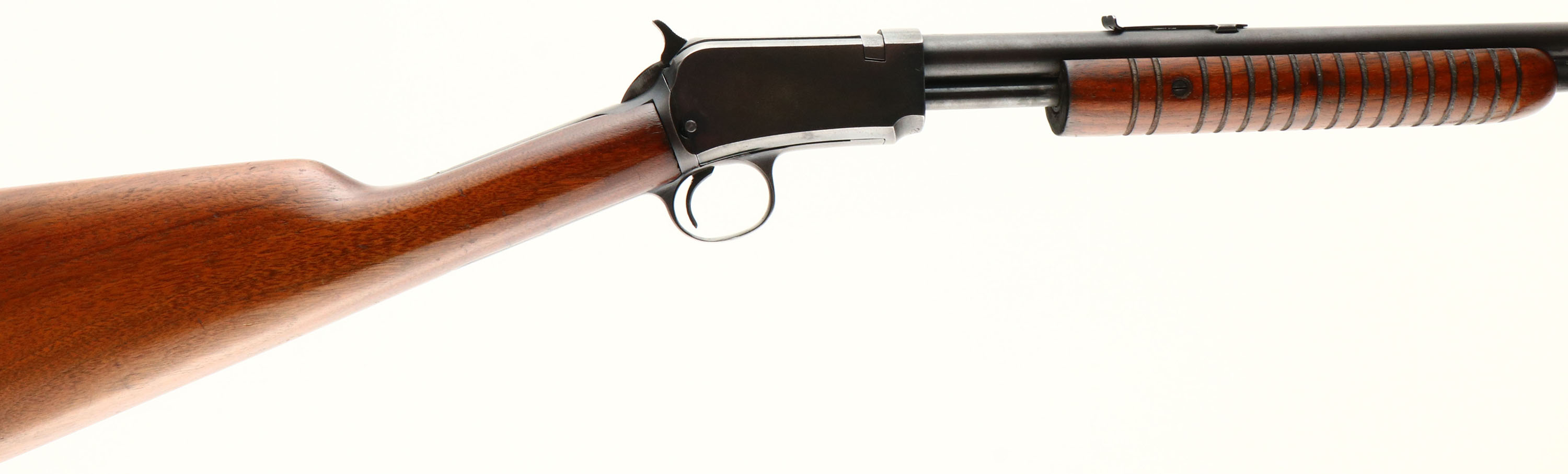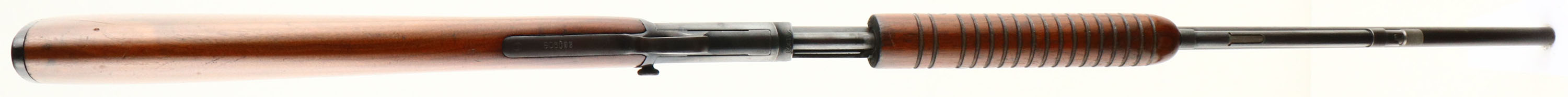 Winchester, Model 62A, CAL: 22 S.L.LR, MFG: 1948, SN: 251908, Pump Action Rifle, 23'' barrel. The original straight grip wood stock & corncob style forearm are excellent. They carry an added thin protective layer of finish over the original factory finish. There are a few light contusions, surface scrapes & rubs The metal blue finish rates 85% overall. Bore is excellent. The barrel holds an adjustable rear sight missing the adjustment elevator & blade front sight. Buttstock carries a Winchester marked, checkered black plastic buttplate. Overall appearance is very good. FFL or C&R Req. - Value: 600 to 1200