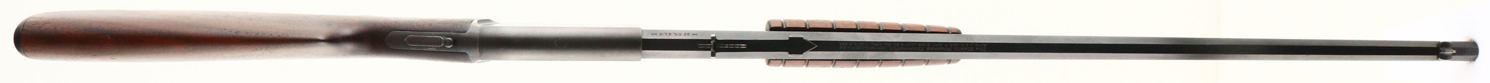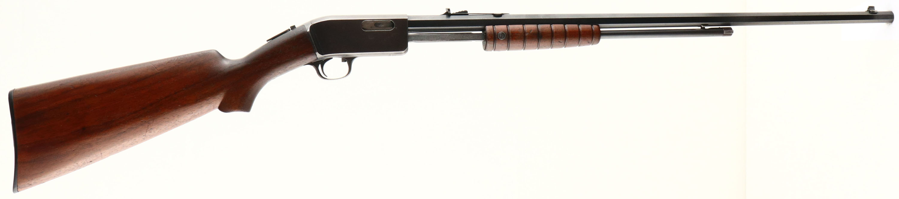 Marlin, Model 38, .22 S. L. & LR. Cal., MFG: 1921-30, SN: A822, Pump Rifle, 24'' Tapered octagon barrel, 2/3rd Tubular mag. Take-down. The original smooth pistol grip wood stocks are very good & solid. The is a 1 1/2'' long toe break glue repair to the stock & part of the stock has been lightly sanded & refinished long ago, probably at the time of the toe repair. The wood displays minor contusions & light scratches, with the overall appearance being very good. The Trademark bullseye insert is in the belly of the stock. The factory metal blue finish is retained at 90% on the barrel, 70% on the receiver & mag tube. Barrel is mounted with an adjustable rear & blade front sights. The rifle barrel has been re-lined. Bore is very good. The The stock carries a checkered Marlin logo buttplate. Rifle action function smooth & properly. A nice looking example. FFL or C&R Req. - Value: 300 to 600