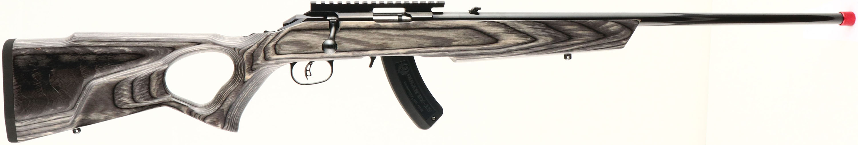 Ruger Model ''American'', CAL: .22 LR, MFG: Modern, SN: 8358-18053, Bolt Action Rifle, 22'' round tapered barrel, with threaded barrel tip. The thumb hole, pistol grip & upgraded Boyds gray & black laminated stock is excellent, with a few light surface blemishes to the original finish. The original metal black finishes are 98% overall. Bore is excellent. The receiver carries a picatinny rail, while the barrel carries a folding rear leaf sight. Black rubber recoil pad. Detachable Ruger BX-15 extended mag. Swing studs. FFL Req. - Value: 300 to 600